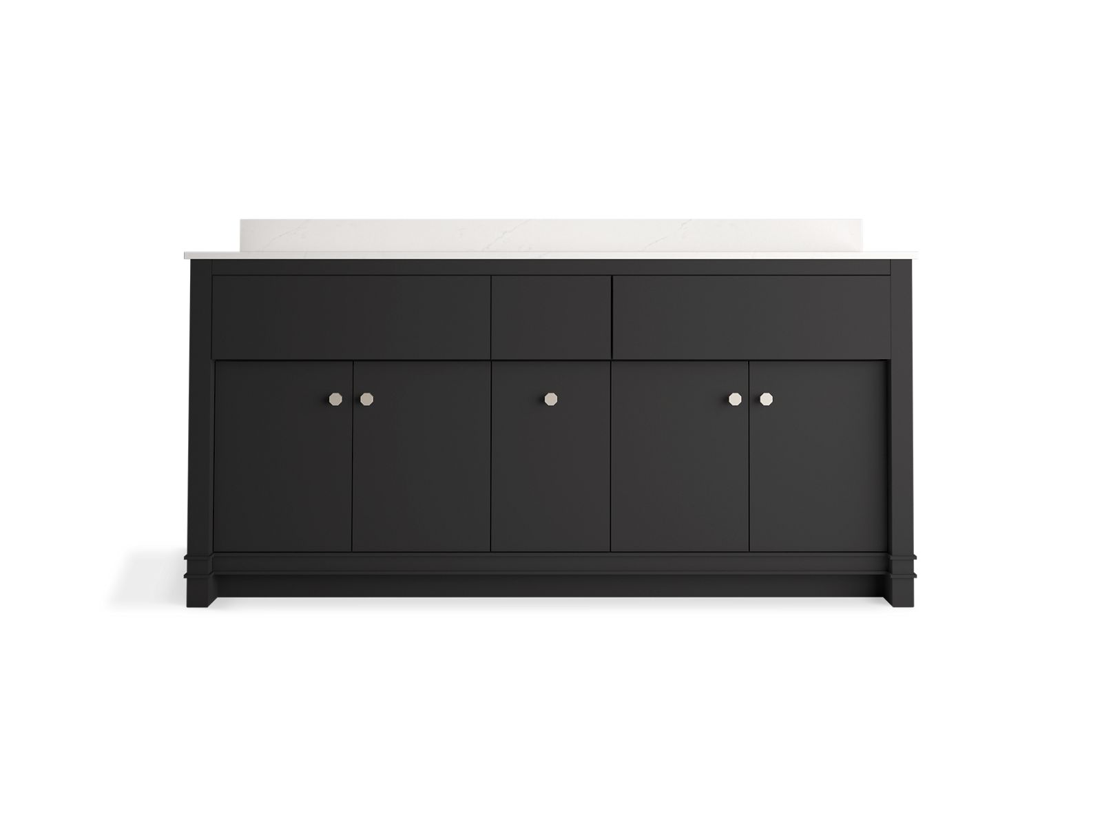 - Set includes cabinet, precut quartz vanity top, backsplash, two sinks, Pinstripe® cabinet hardware in Vibrant® Brushed Nickel