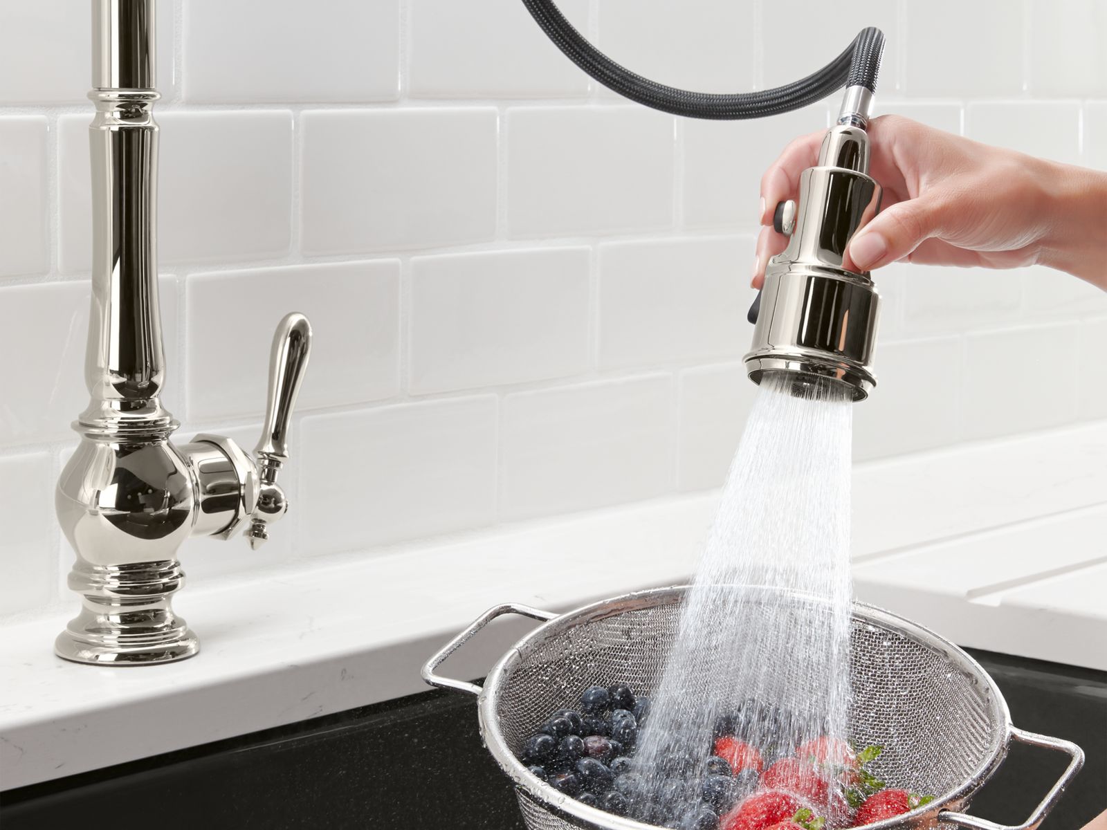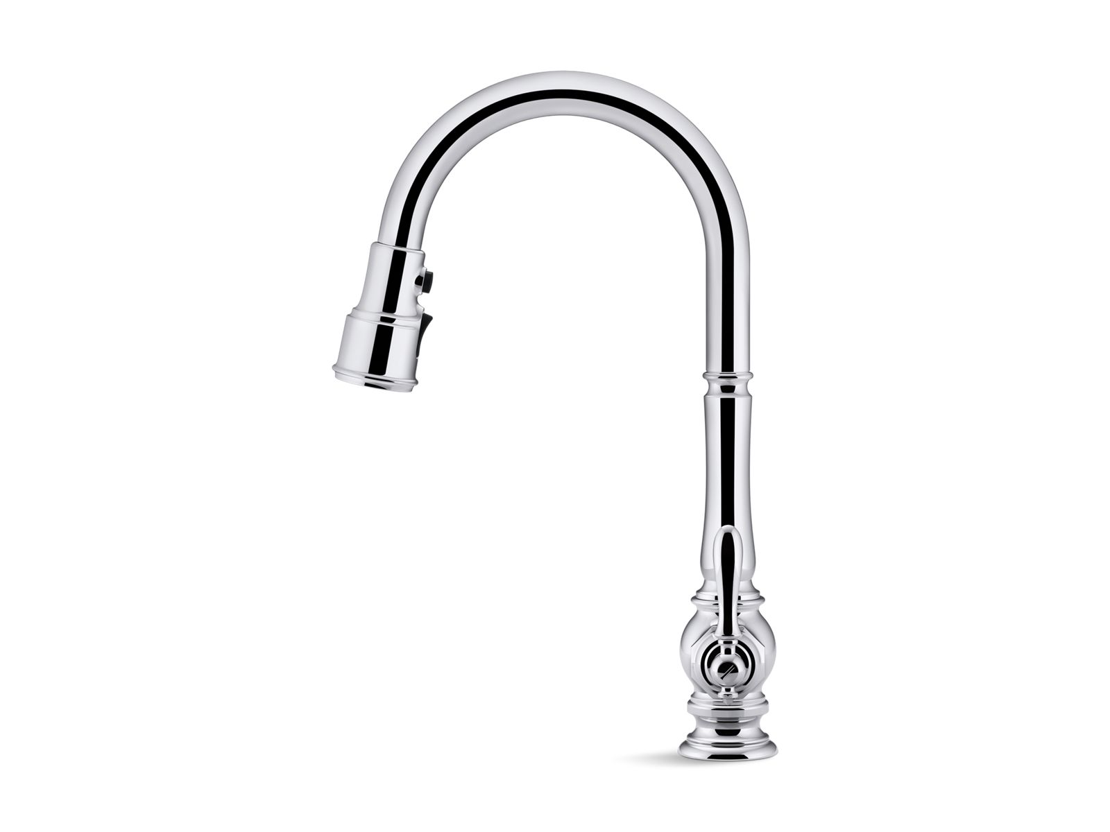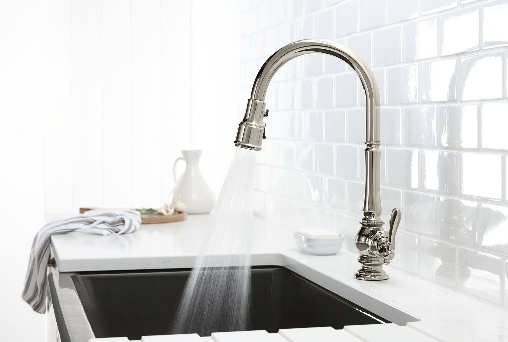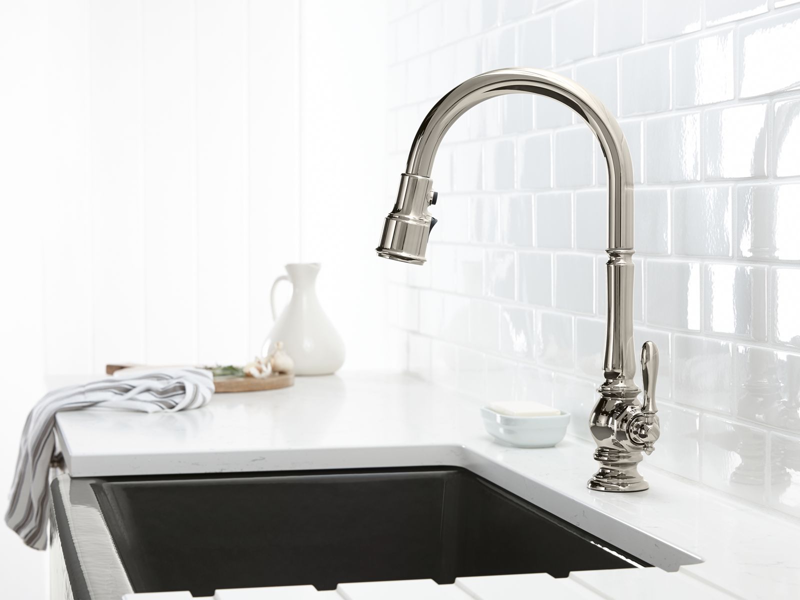 The KOHLER® Artifacts faucet collection brings you classic designs reimagined in fresh ways for various task areas of the kitchen. This Artifacts pull-down kitchen sink faucet displays vintage style with its high-arch spout and turned lever handle. The three-function pull-down sprayhead has you covered for a range of tasks: BerrySoft spray for food prep, an aerated stream for filling pots, and Sweep spray for cleaning. Kohler's DockNetik docking system secures the sprayhead to the spout.