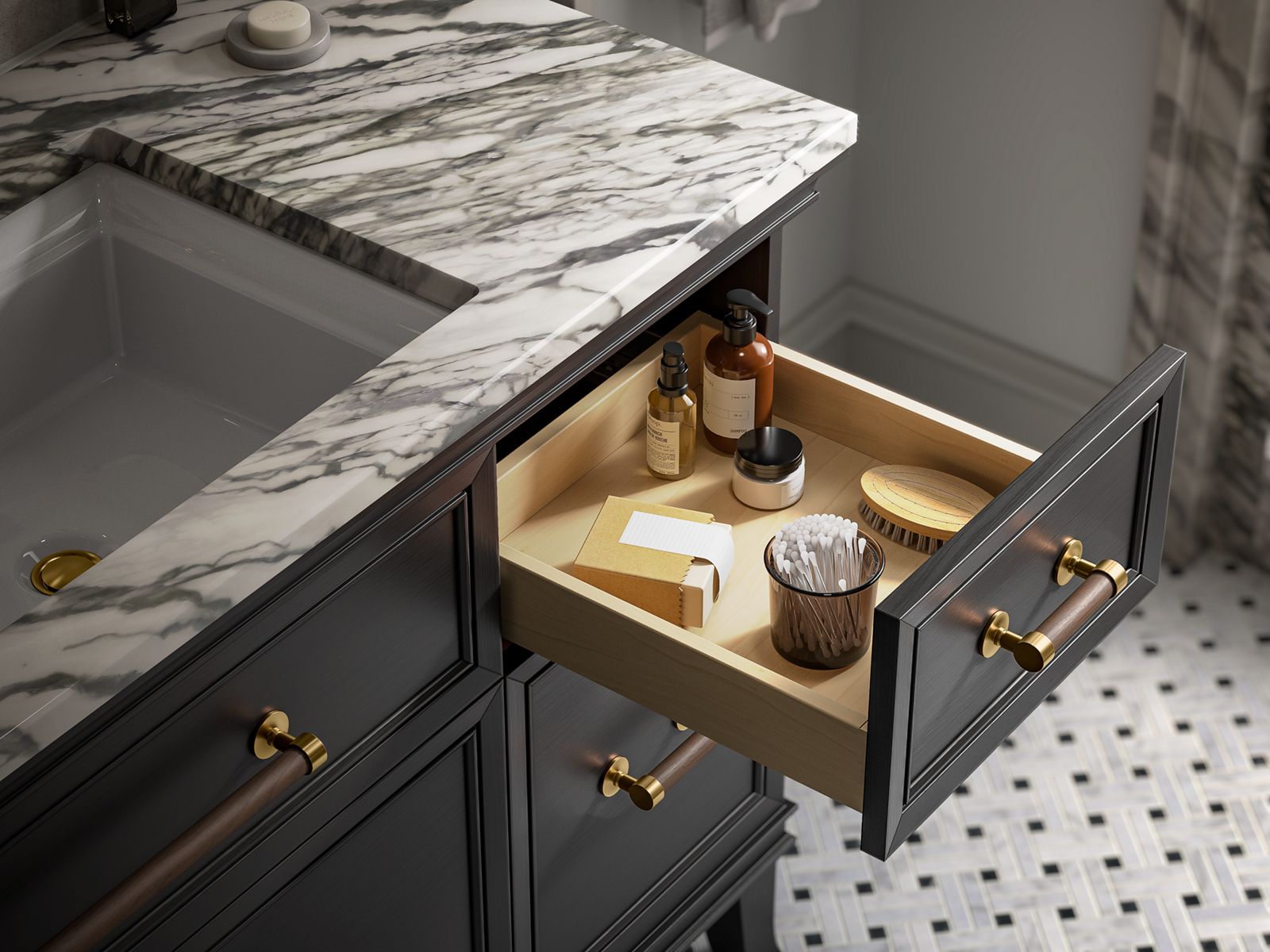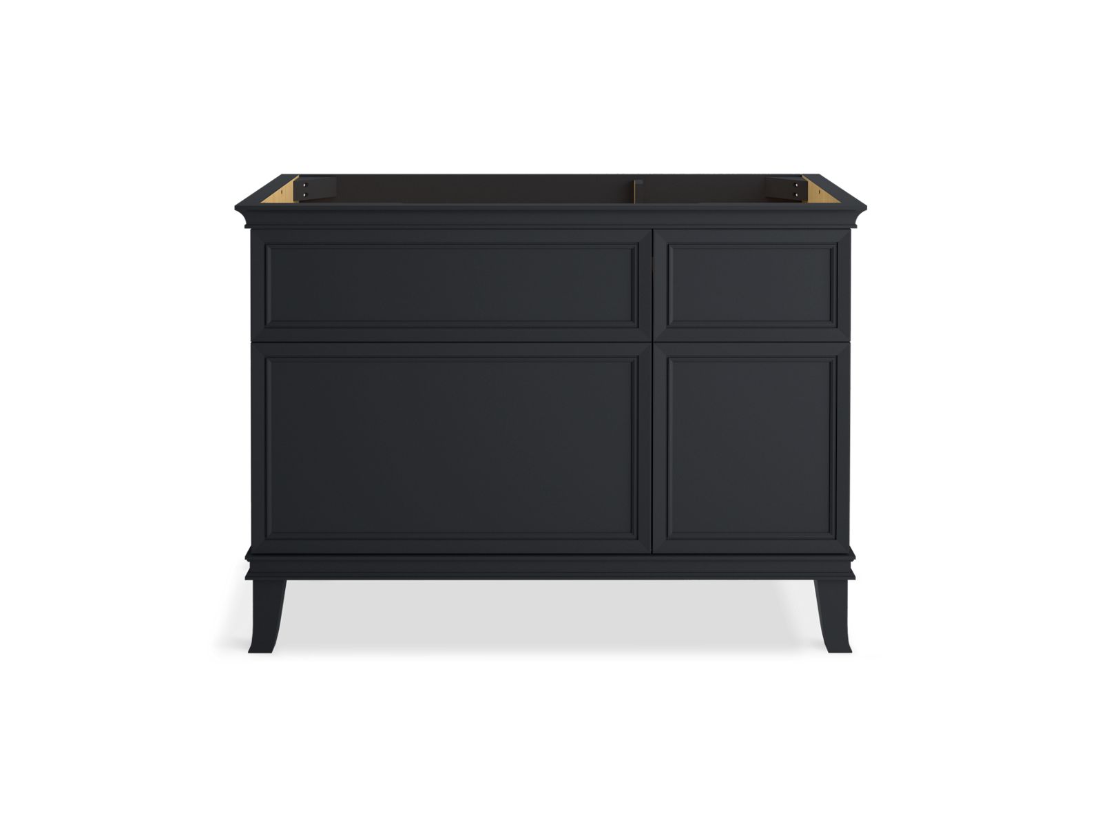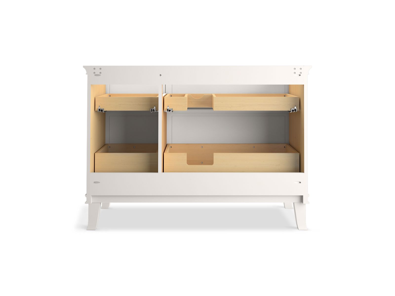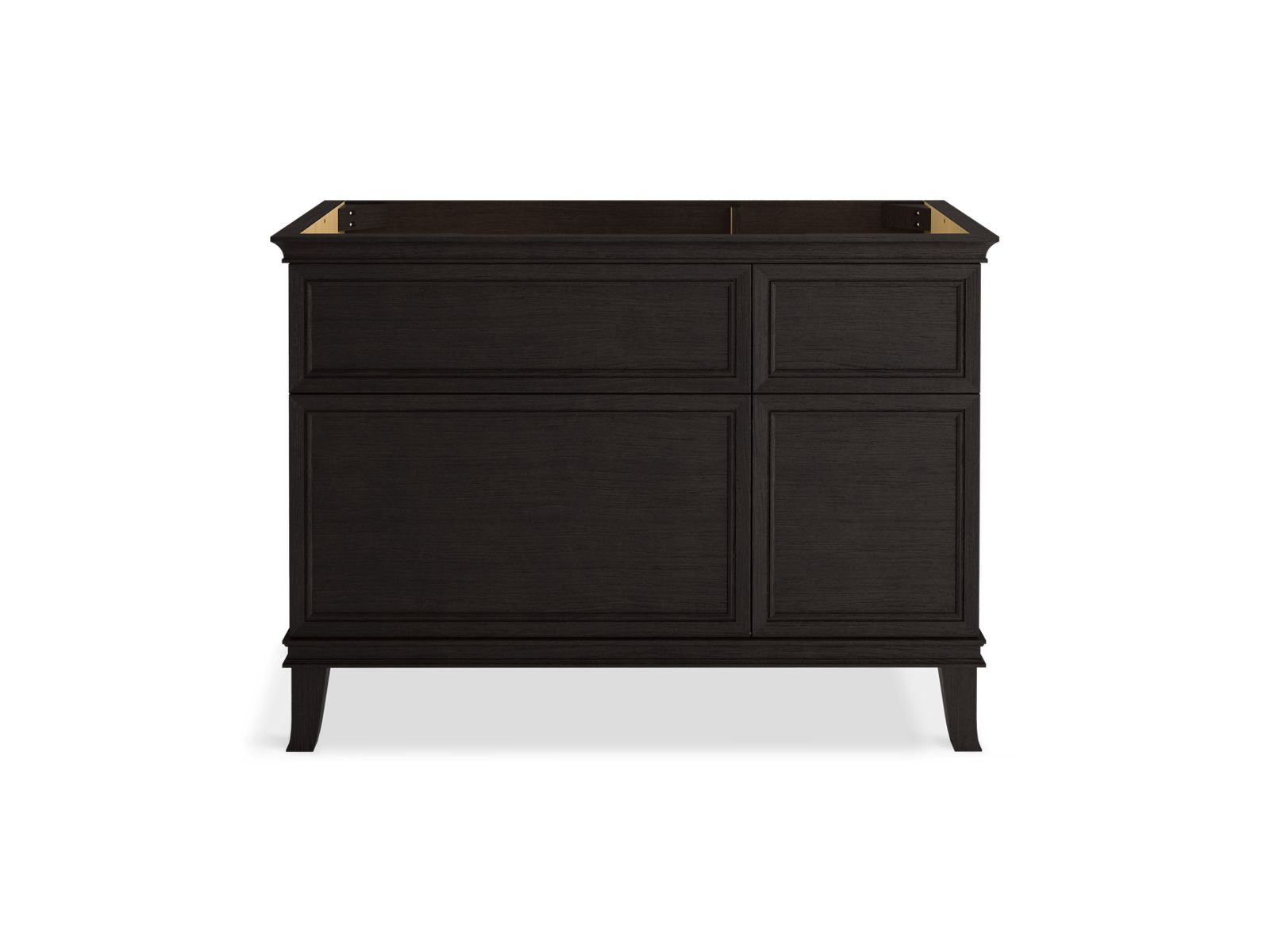 Elegant minimalist design meets midcentury traditional influence and Kohler craftsmanship in the Artifacts bathroom vanity. This simply ornamented, all-drawer cabinet features cornice molding reminiscent of an American Federal-style bookcase while flared solid-wood legs inspired by early nineteenth-century linen presses elevate the vanity’s style and off-floor functionality. Customize your bathroom centerpiece with a coordinating quartz top, contrasting industrial-style drawer pulls, and organizational in-drawer accessories (sold separately) for a look that fits your aesthetic and space.