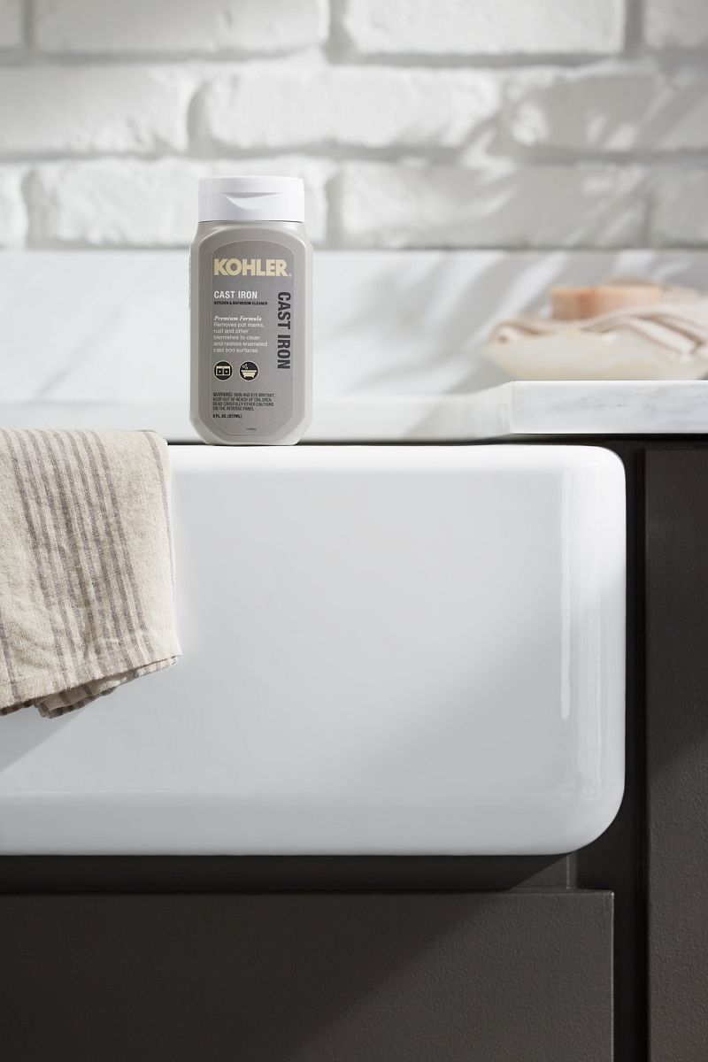 KOHLER cast iron cleaner removes pot marks, rust and other blemishes to clean and restore enameled cast iron surfaces.