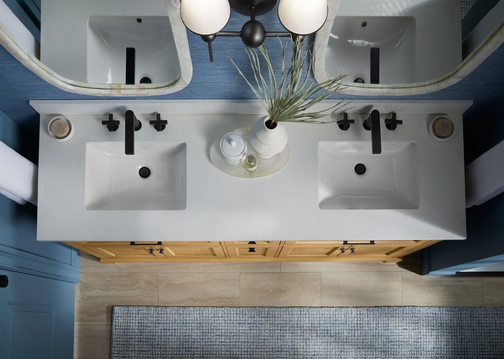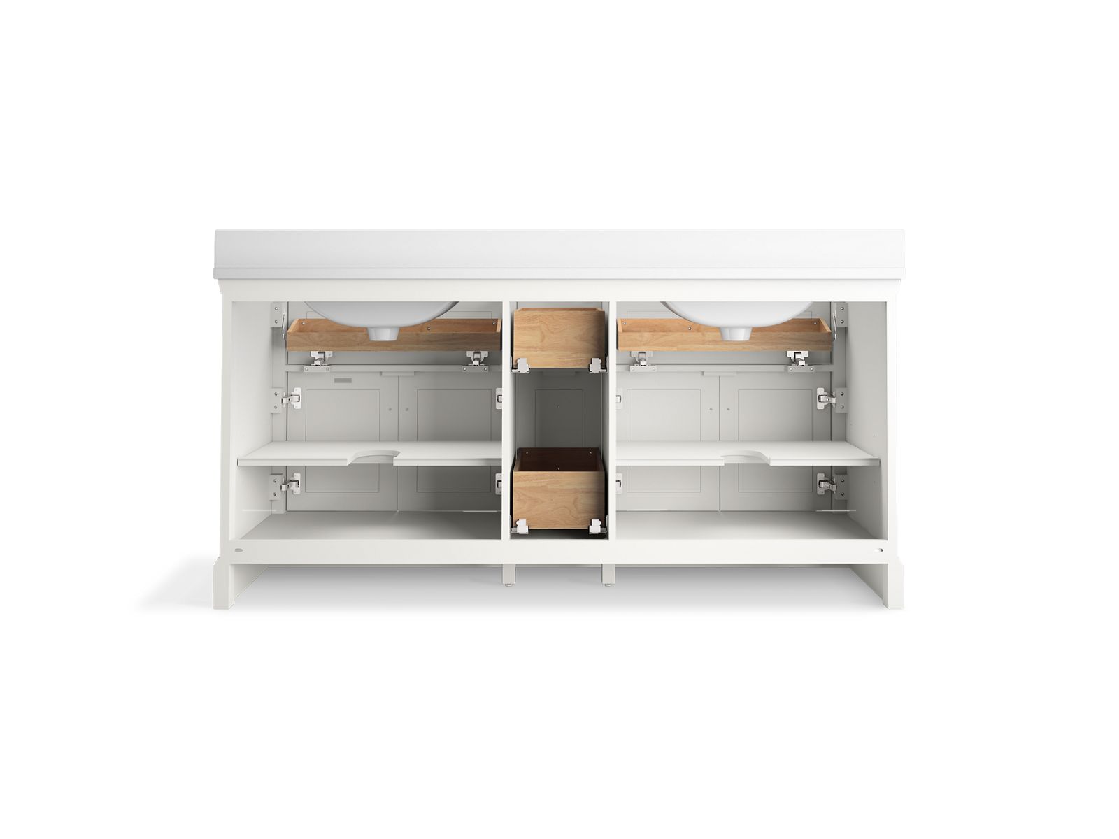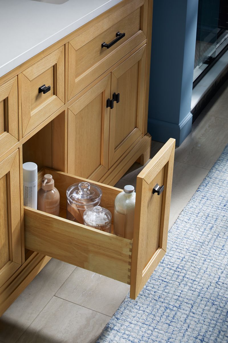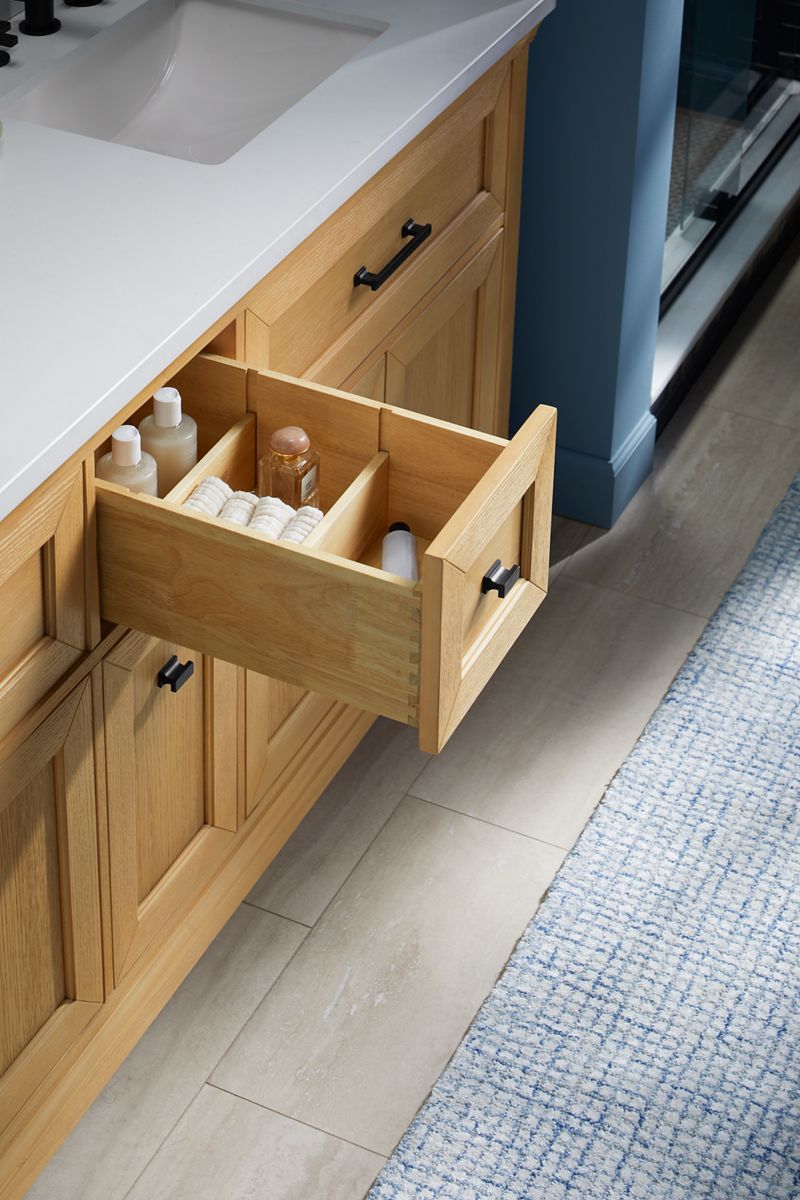 - Convenient tilt-down drawer under each basin for storing smaller, frequently-used items