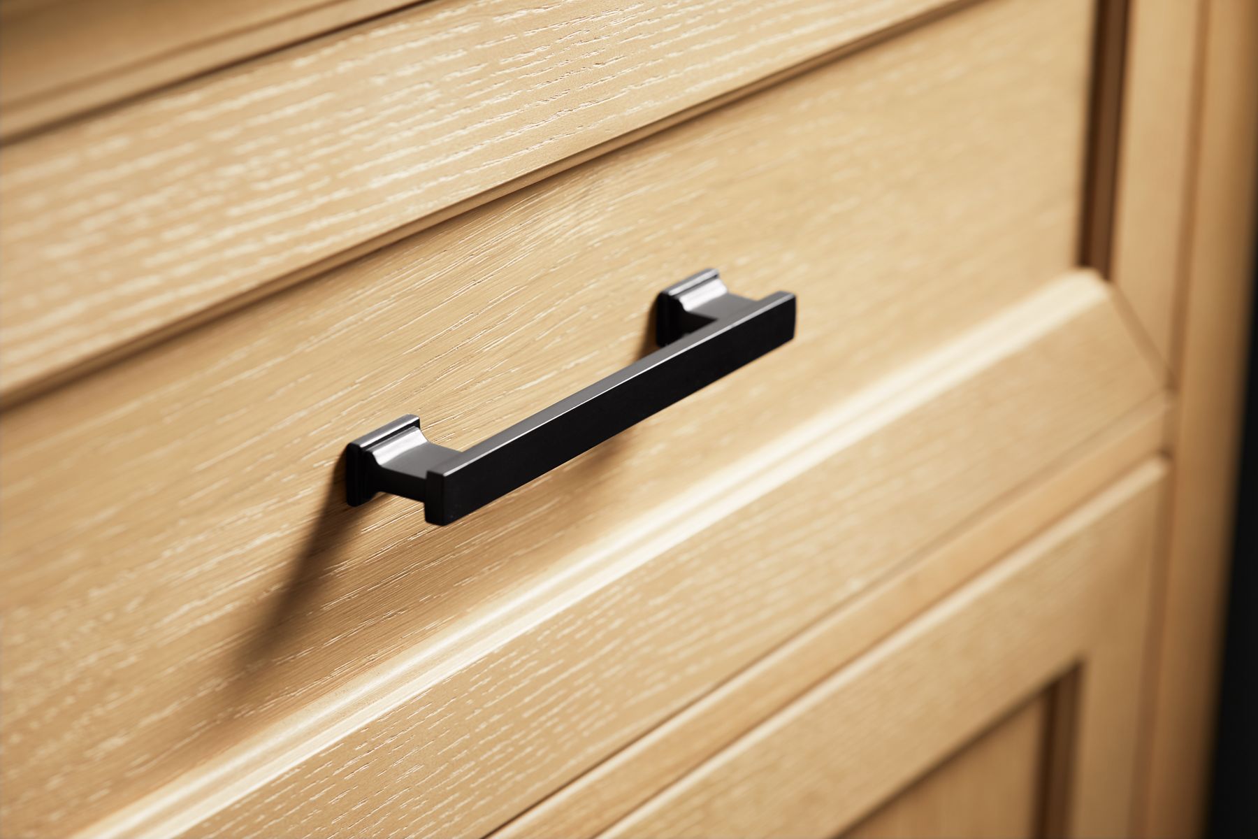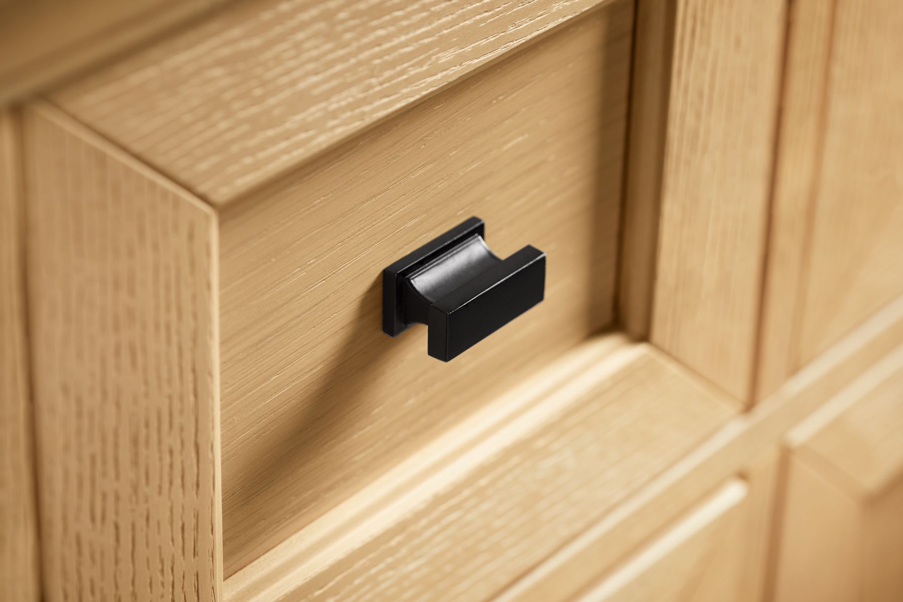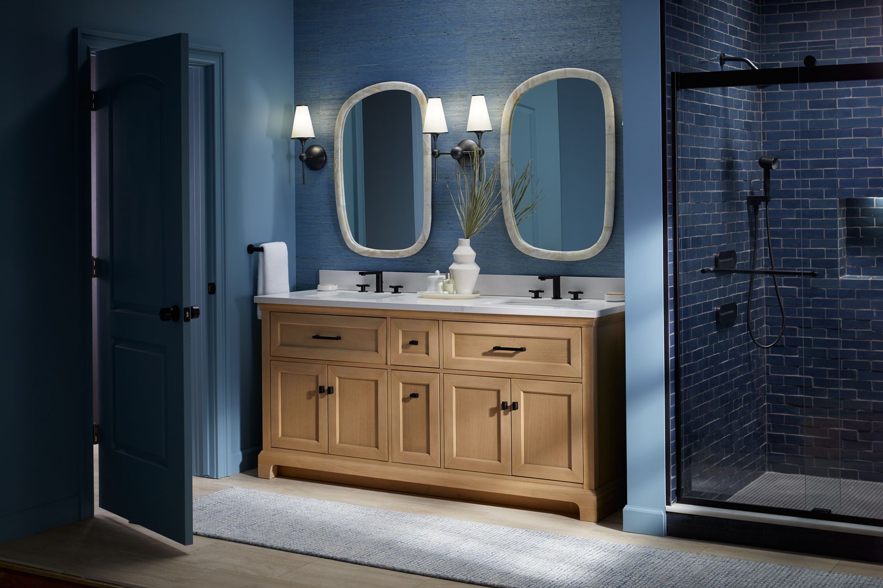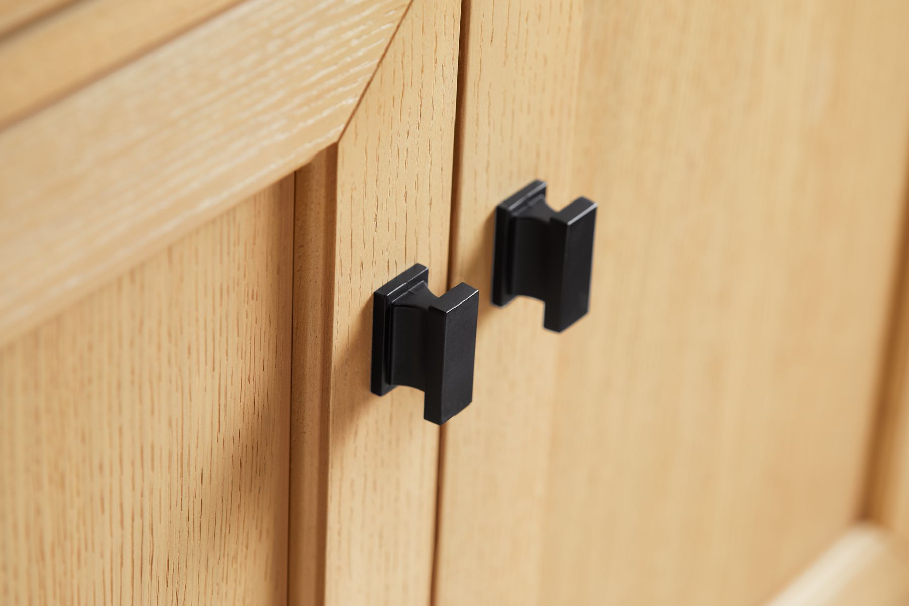 - Vibrant® Brushed Nickel hardware included on White vanities, Vibrant Brushed Moderne Brass hardware on Ferrous Grey and Tidal Blue vanities, and Matte Black hardware on Light Oak vanities