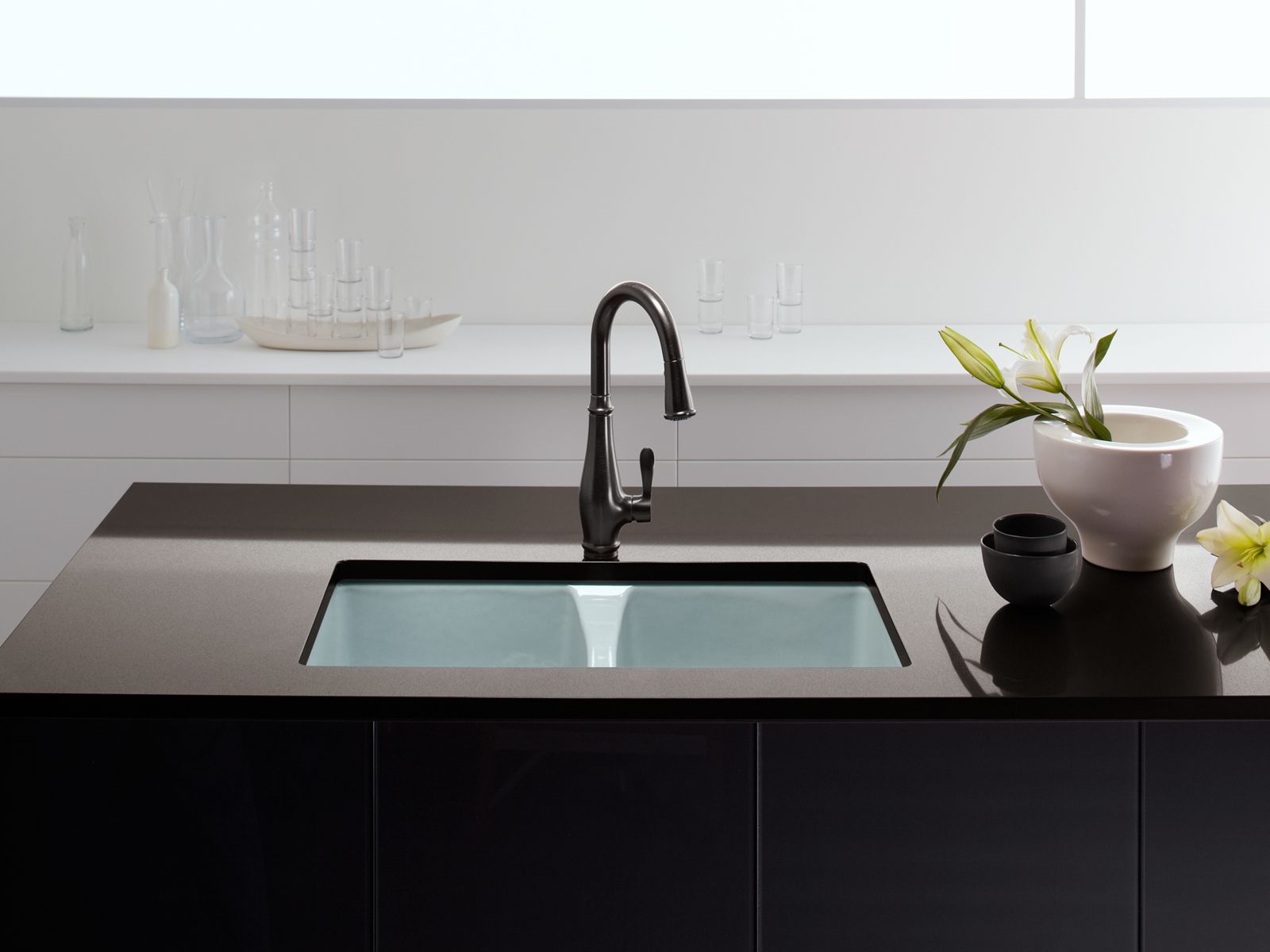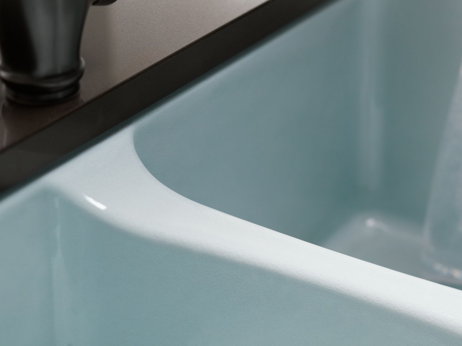 With its classic, versatile style, Deerfield instantly updates any kitchen. Redesigned with deeper bowls and tighter corners, this double-equal sink features approximately 20 percent more basin volume than previous models, giving you plenty of room for cleaning and prep with minimized splashing. A new slimmer saddle and rim offer a crisp, clean look. Crafted from enameled cast iron, this sink resists chipping, cracking, or burning for years of beauty and reliable performance.