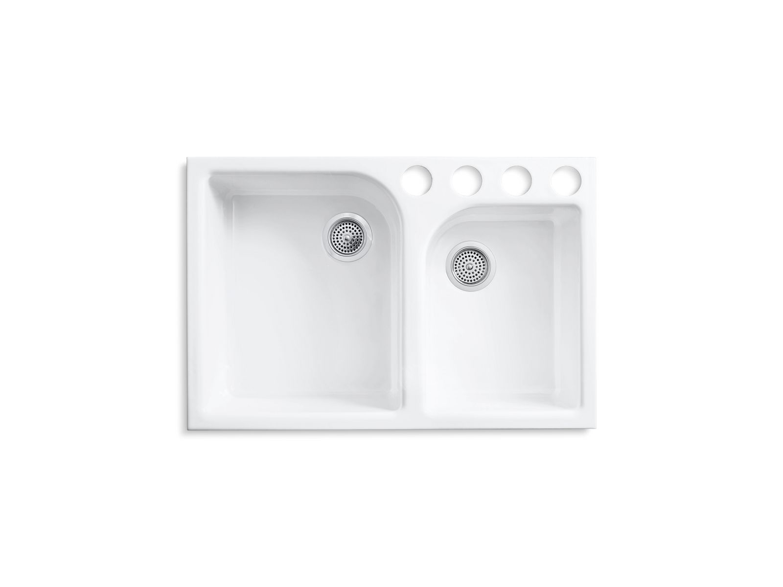 Handle kitchen tasks like a pro with the Executive Chef sink, featuring an innovative offset faucet ledge to maximize basin space. The large/medium bowls allow you to keep clean and dirty dishes separate while offering plenty of room for oversize pots and pans. Crafted from enameled cast iron, this sink resists chipping, cracking, or burning for years of beauty and reliable performance.