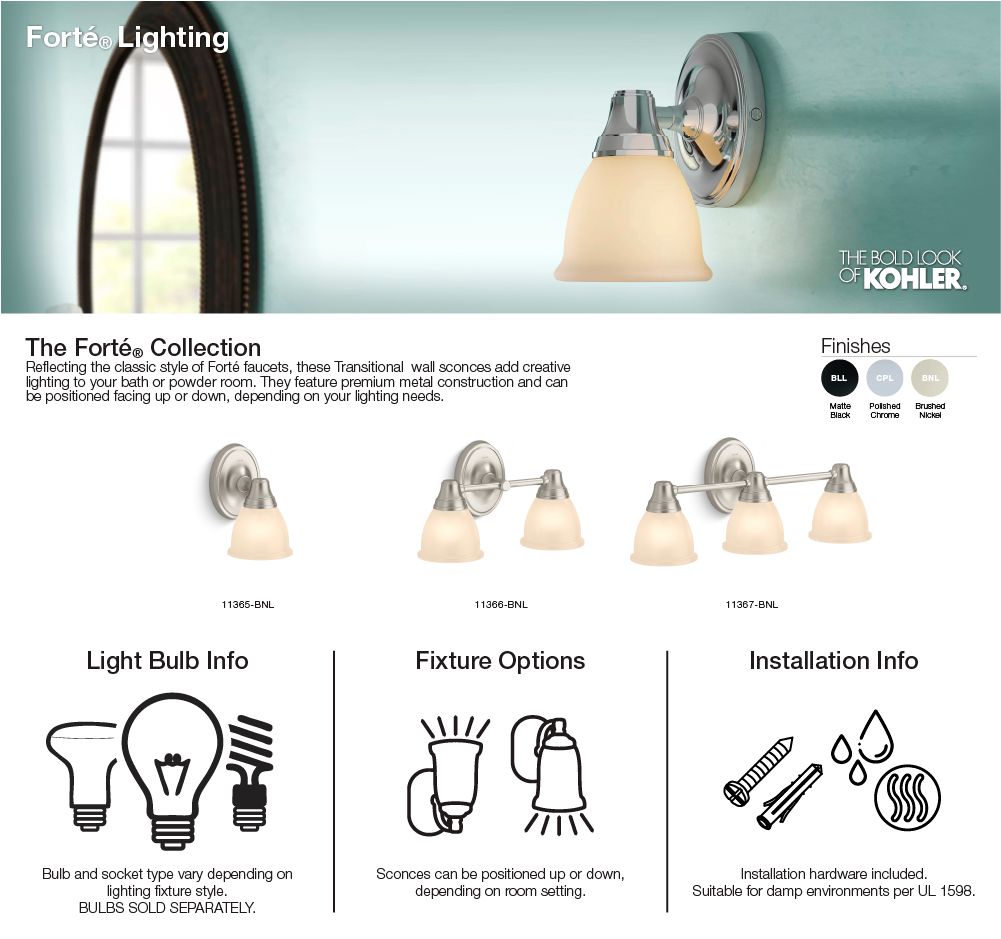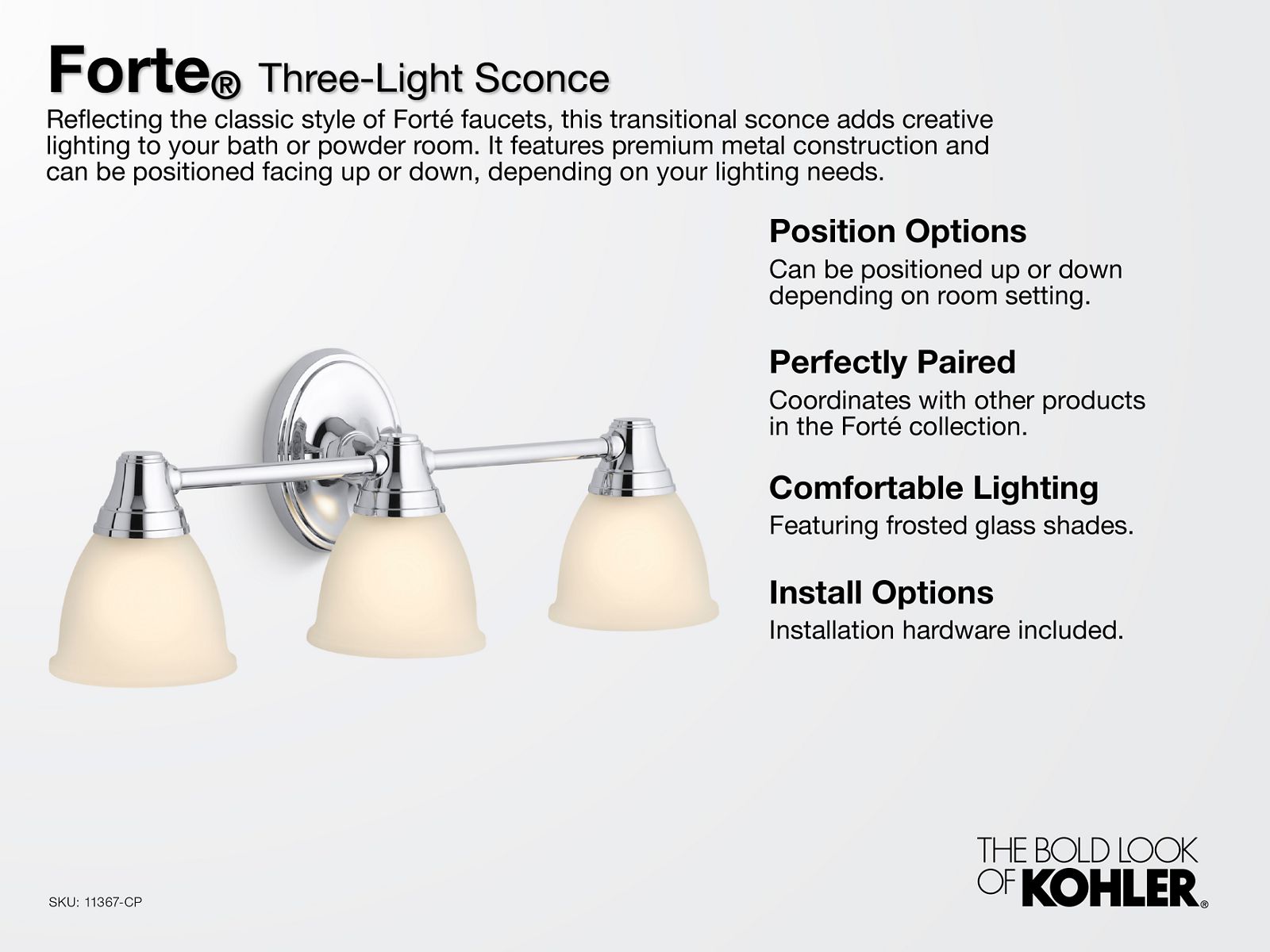 Reflecting the classic style of Forté faucets, this Transitional triple wall sconce adds creative lighting to your bath or powder room. It features premium metal construction and can be positioned facing up or down, depending on your lighting needs.