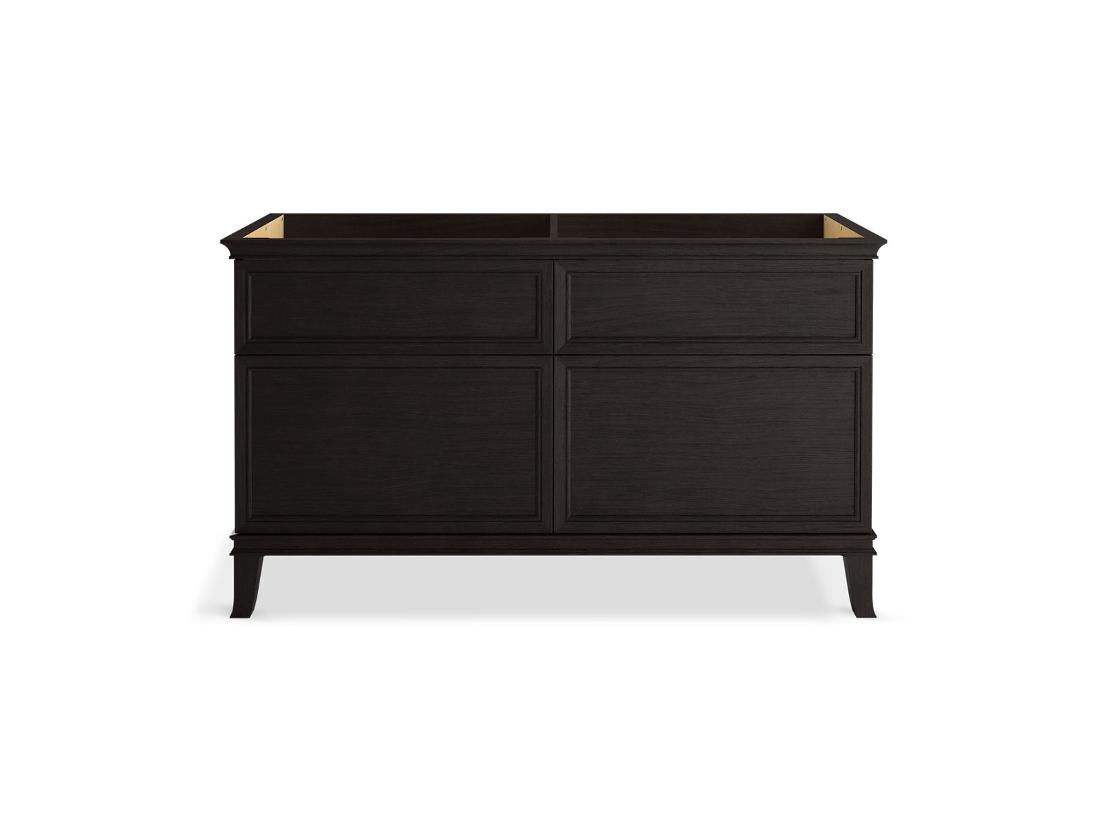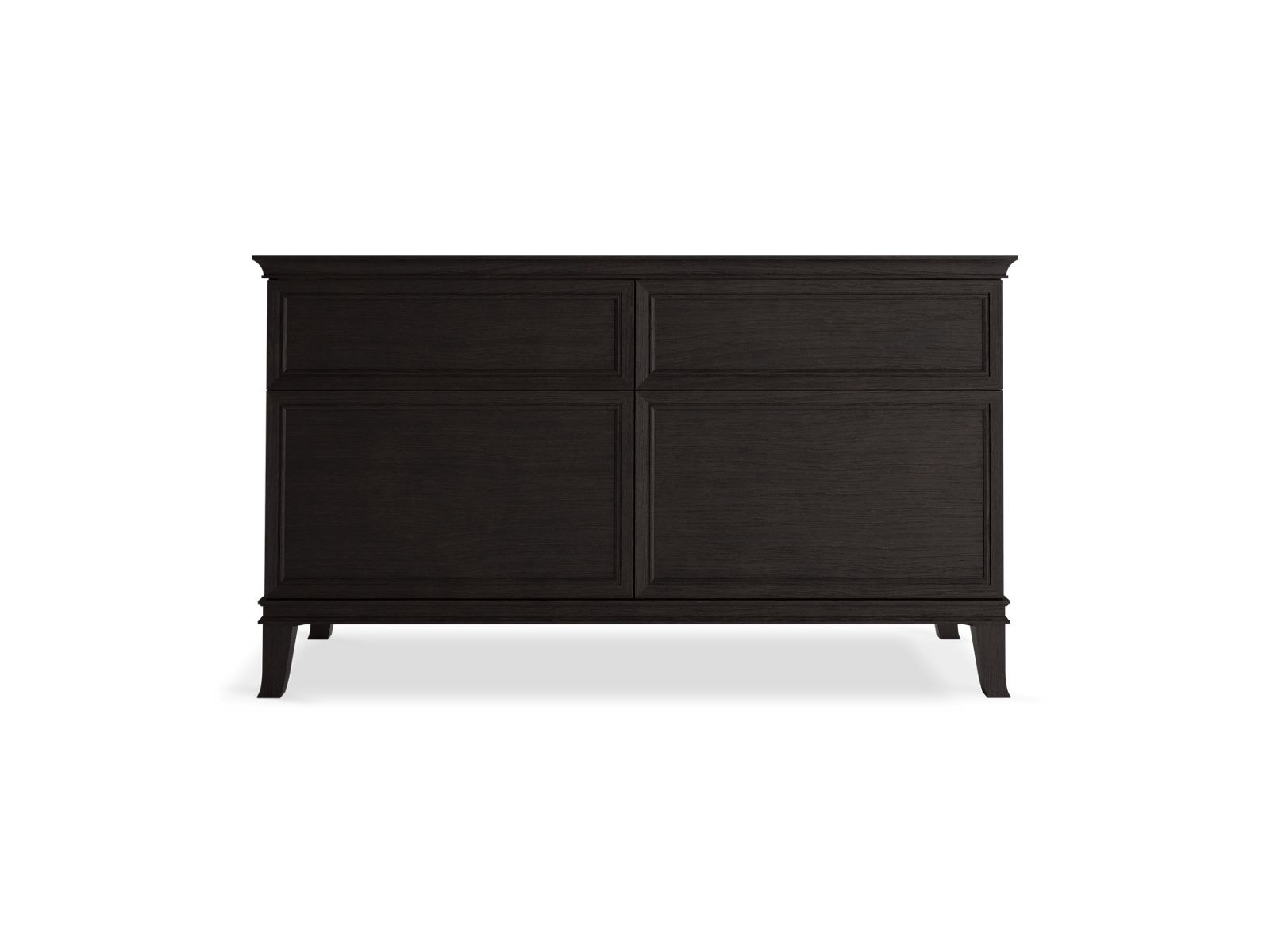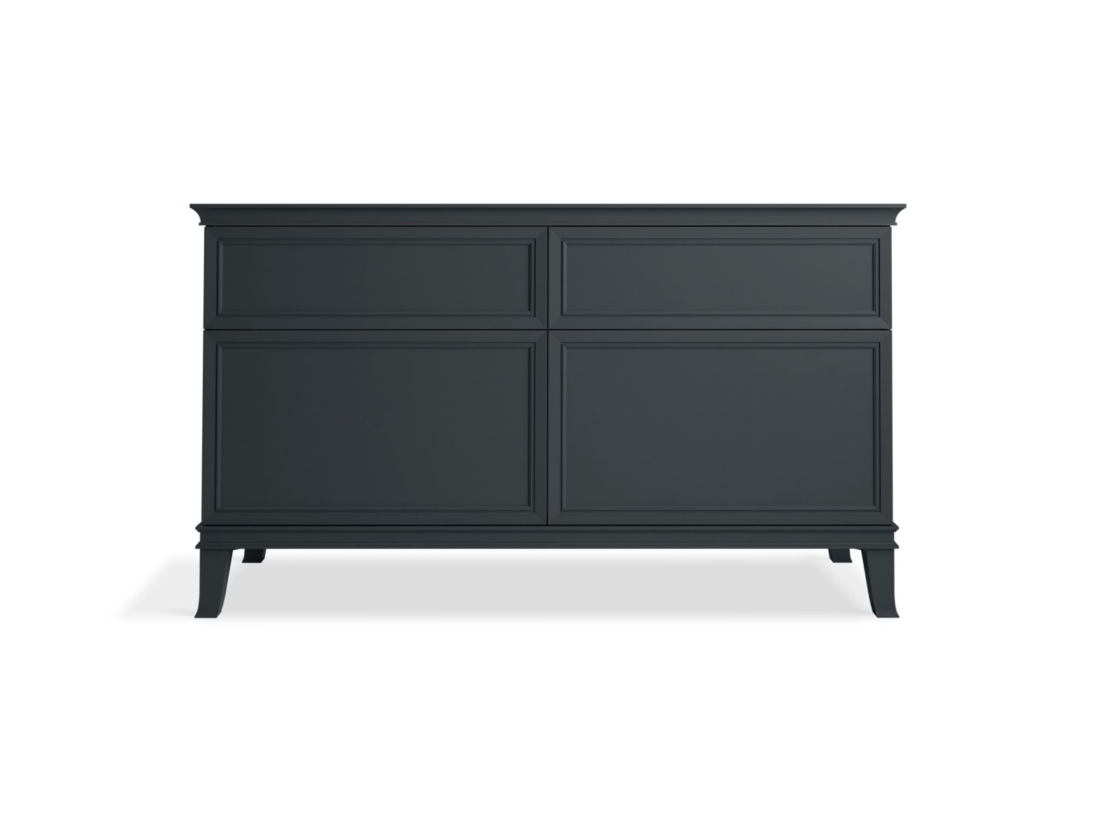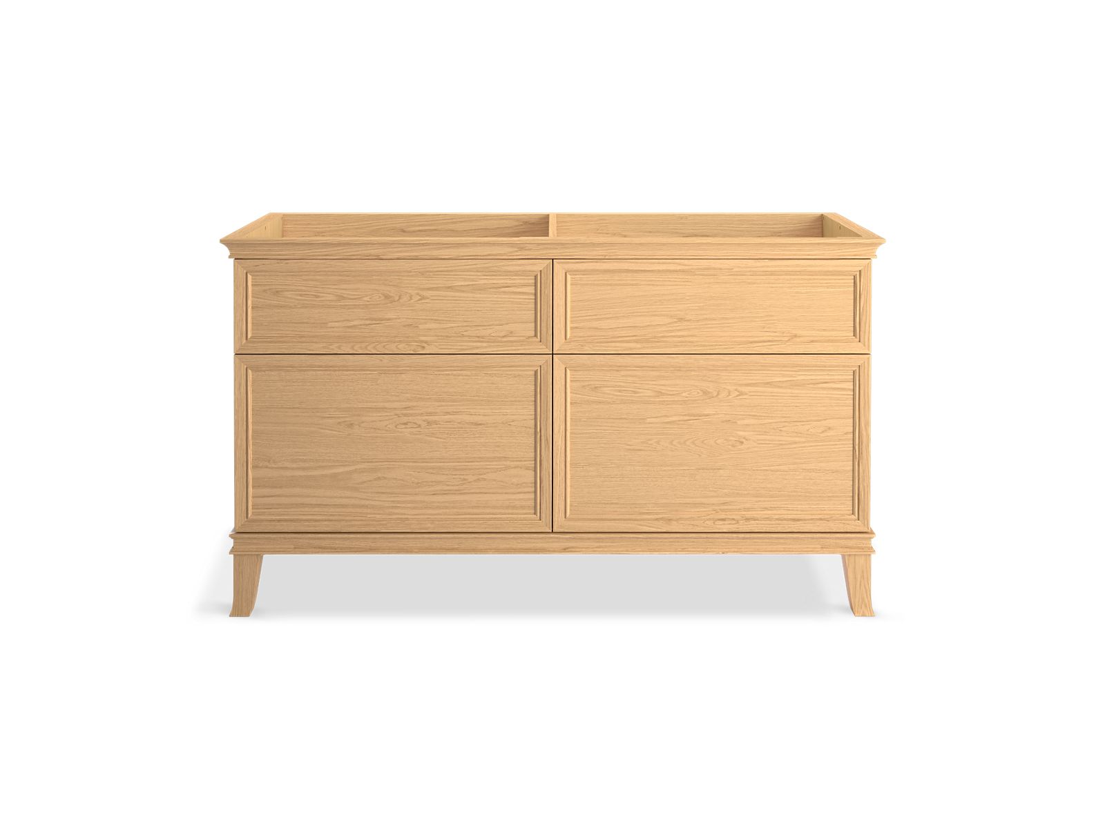 Elegant minimalist design meets midcentury traditional influence and Kohler craftsmanship in the Artifacts bathroom vanity. This simply ornamented, all-drawer cabinet features cornice molding, reminiscent of an American Federal-style bookcase, while flared solid-wood legs inspired by early nineteeth-century linen presses elevate the vanity’s style and off-floor functionality. Customize your bathroom centerpiece with a coordinating quartz top, contrasting industrial-style drawer pulls, and organizational in-drawer accessories (sold separately)—for a look that fits your aesthetic and space.