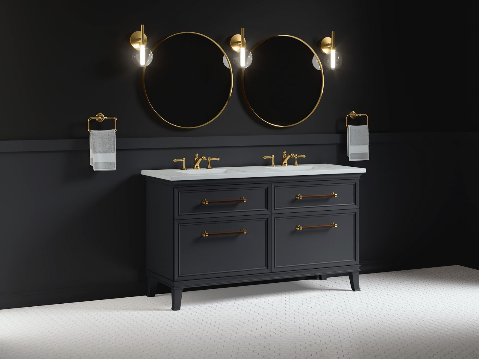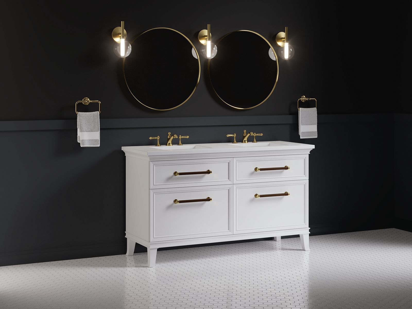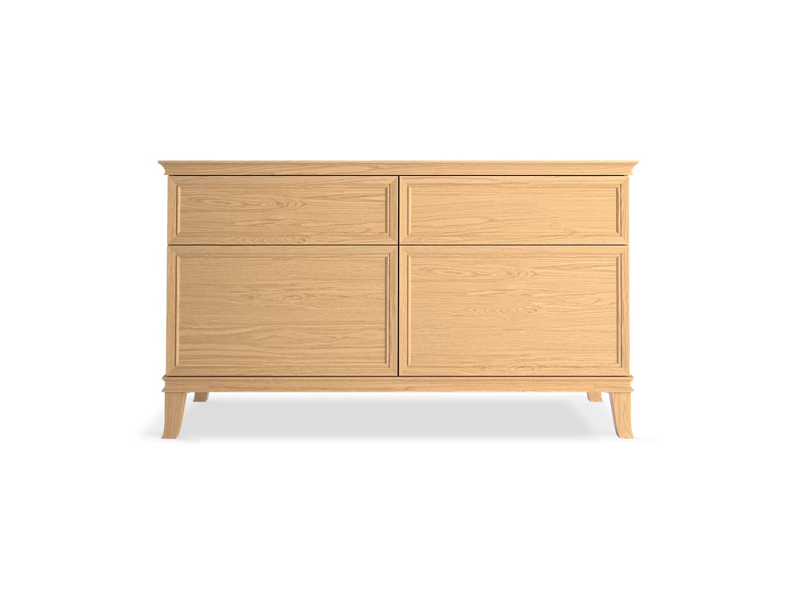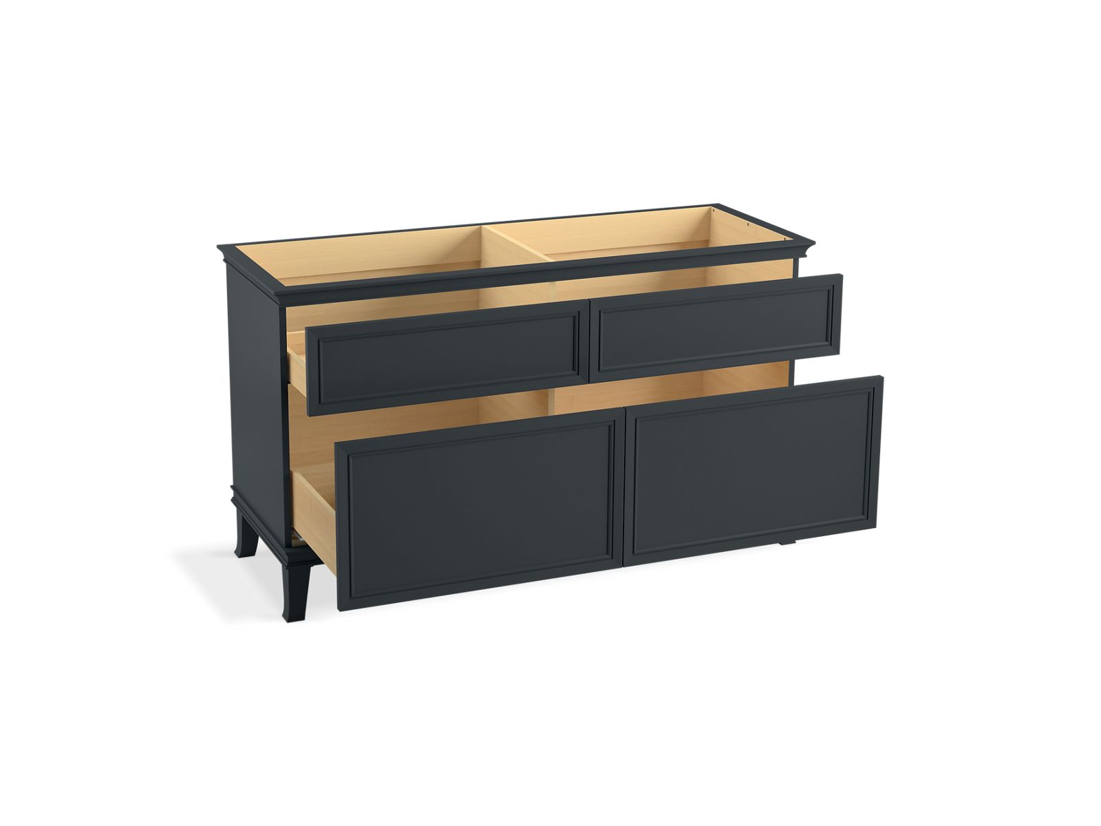Elegant minimalist design meets midcentury traditional influence and Kohler craftsmanship in the Artifacts bathroom vanity. This simply ornamented, all-drawer cabinet features cornice molding, reminiscent of an American Federal-style bookcase, while flared solid-wood legs inspired by early nineteeth-century linen presses elevate the vanity’s style and off-floor functionality. Customize your bathroom centerpiece with a coordinating quartz top, contrasting industrial-style drawer pulls, and organizational in-drawer accessories (sold separately)—for a look that fits your aesthetic and space.