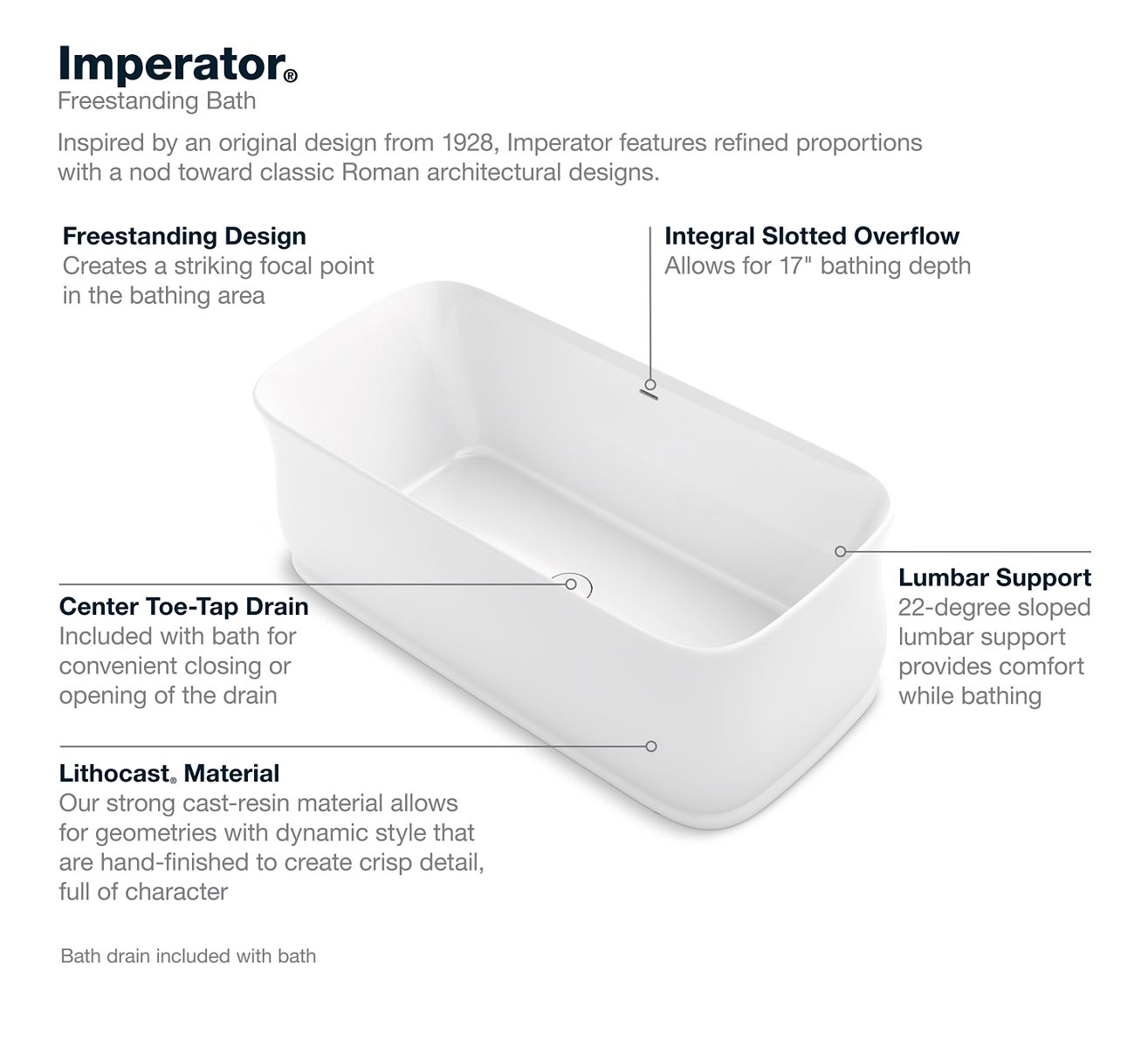Inspired by an original design from 1928, the Imperator features refined proportions with a nod toward classic Roman architectural styles. This Imperator freestanding bath offers gracefully sculpted curves that cradle your body as you settle in for a deep, restorative soak. KOHLER Lithocast® cast resin material allows for geometries with dynamic style and crisp, hand-finished detail rich with character. KOHLER Lithocast® Gloss cast resin is lightweight and easy to clean, with a high-gloss finish.