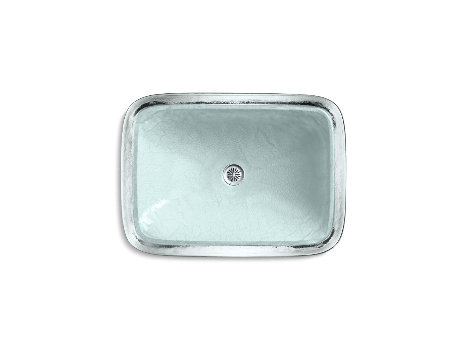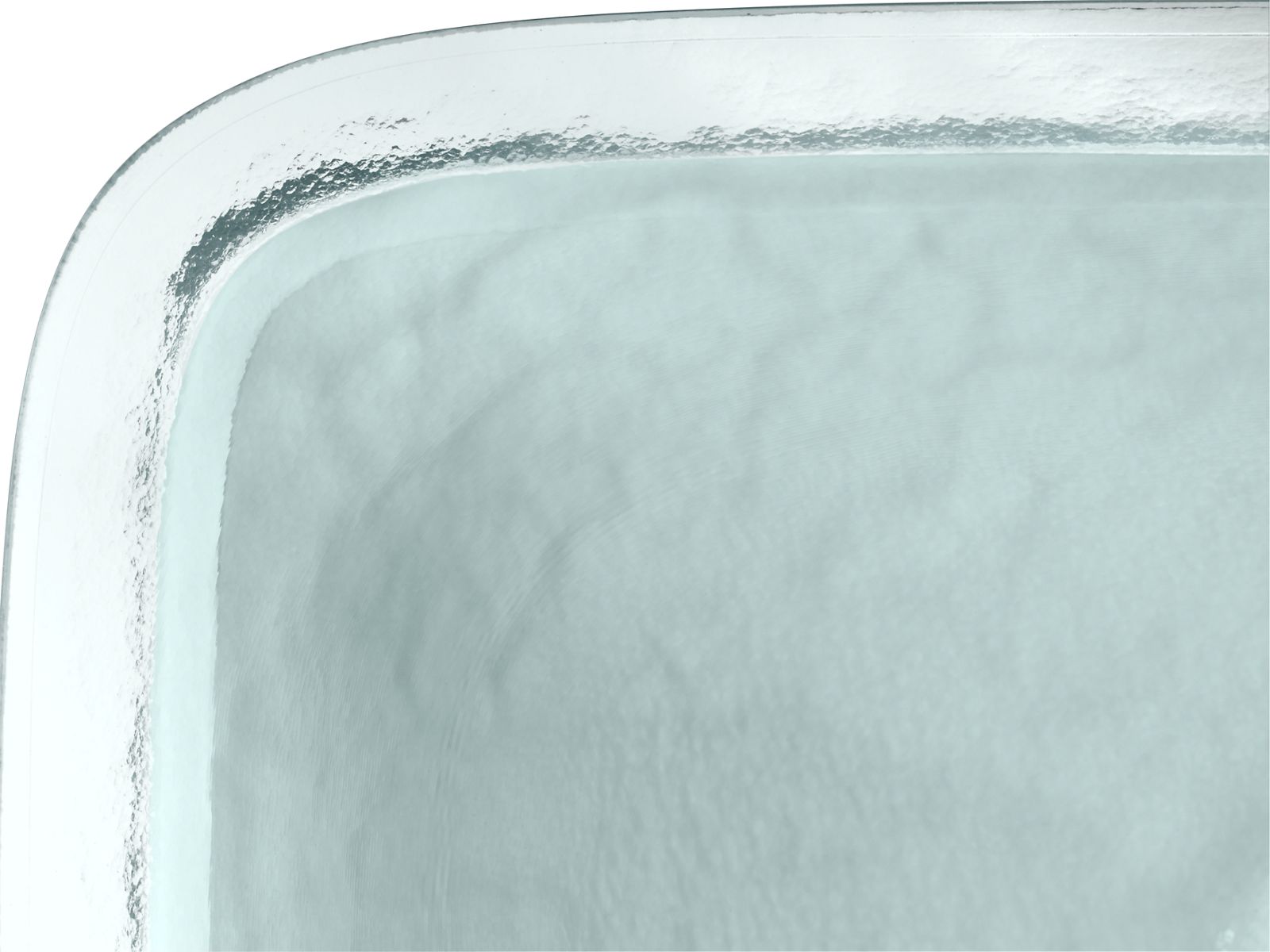 Made by American craftsmen using stunning pressed-glass construction, the Inia Wading Pool sink creates a soothing focal point in any bathroom or powder room. Its deep, generously sized basin helps minimize splashing, and the glass surface cleans up easily. The subtle hammered texture with painted underside in Dew helps to conceal vanity items and fixtures from view.