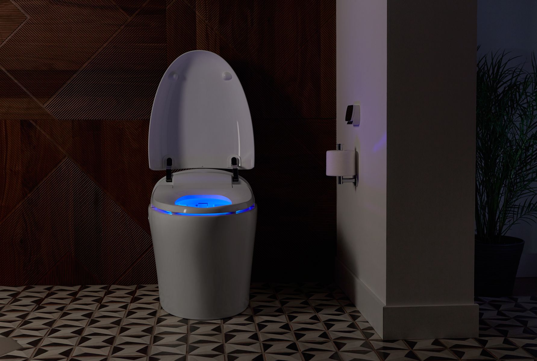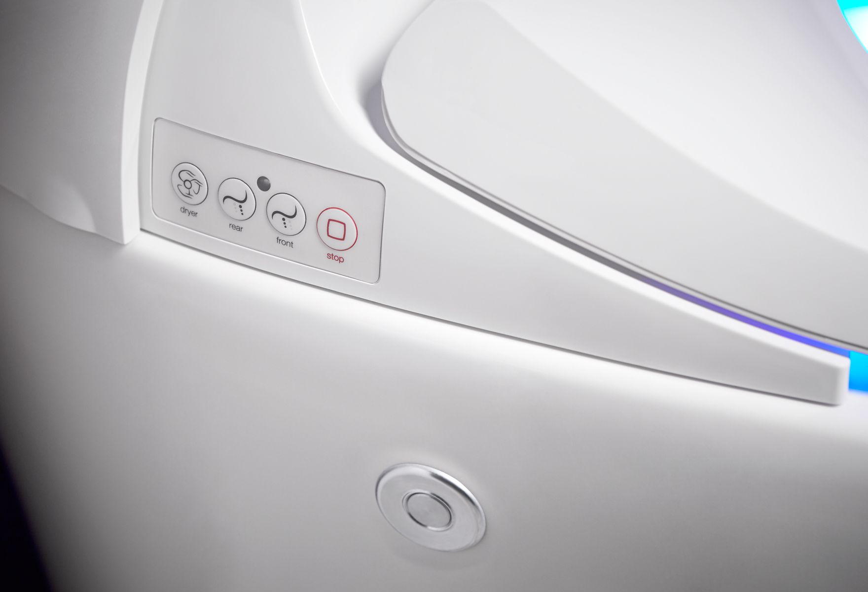 - Compact, streamlined one-piece smart toilet with integrated personal cleansing