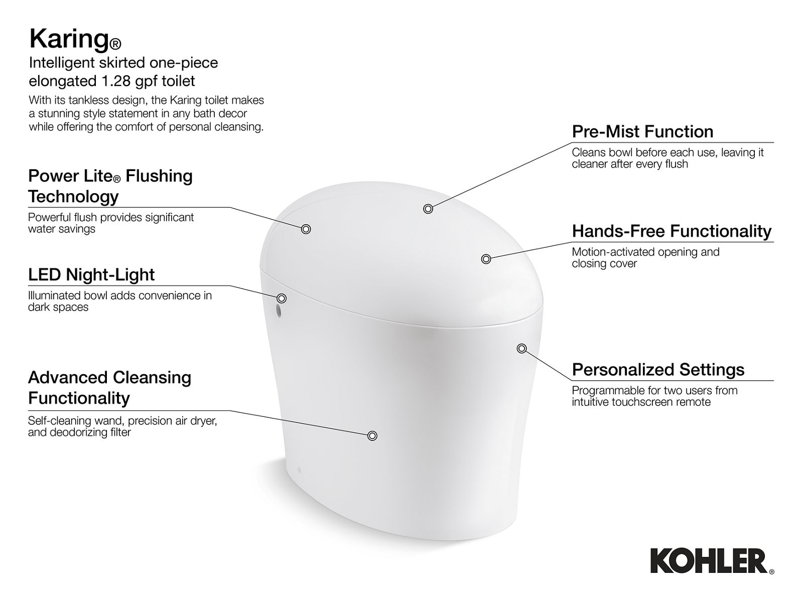 Minimalist style meets maximum hygiene. The next-generation Karing® smart toilet features an ergonomic seat design for a streamlined look with the comfort of integrated personal cleansing. Use the advanced touchscreen remote to create your preferred settings for warmth, cleansing, and drying. Bowl is automatically misted prior to use for more effective rinsing while flushing. The powerful 1.08-gallon flush provides significant water savings compared to a 1.28- or 1.6-gallon toilet.