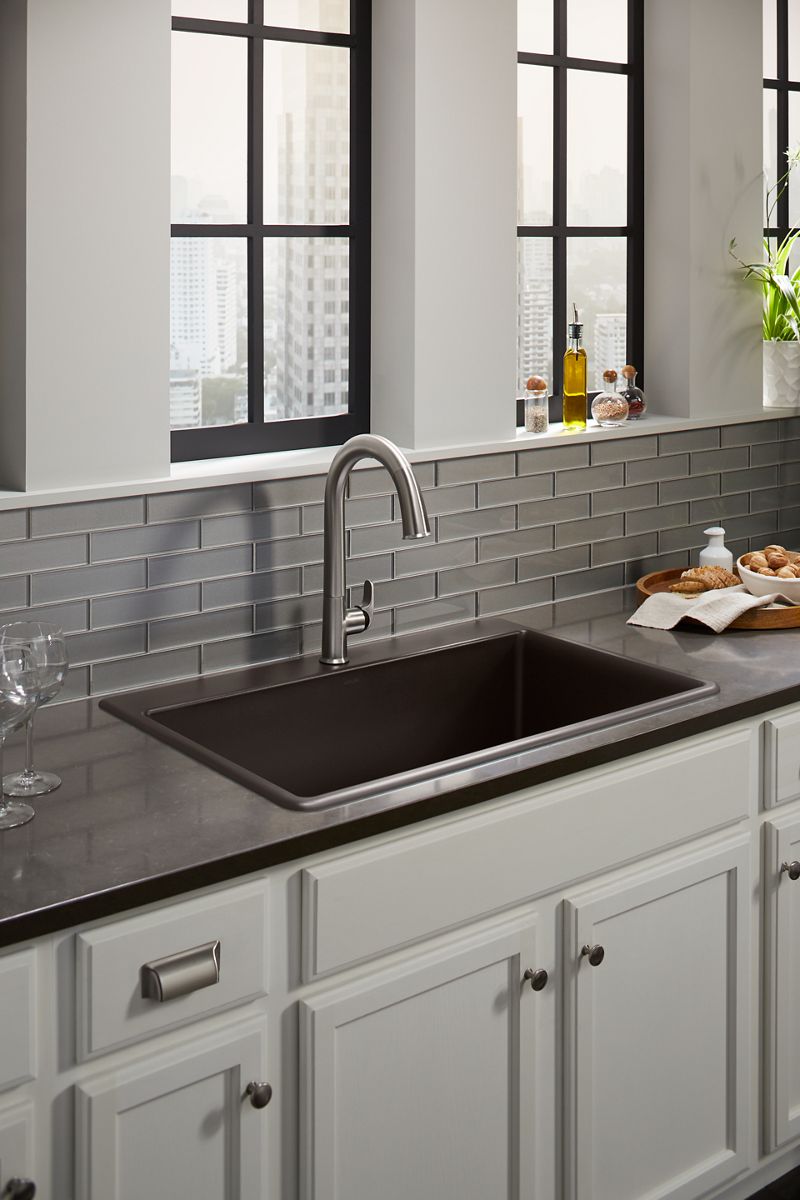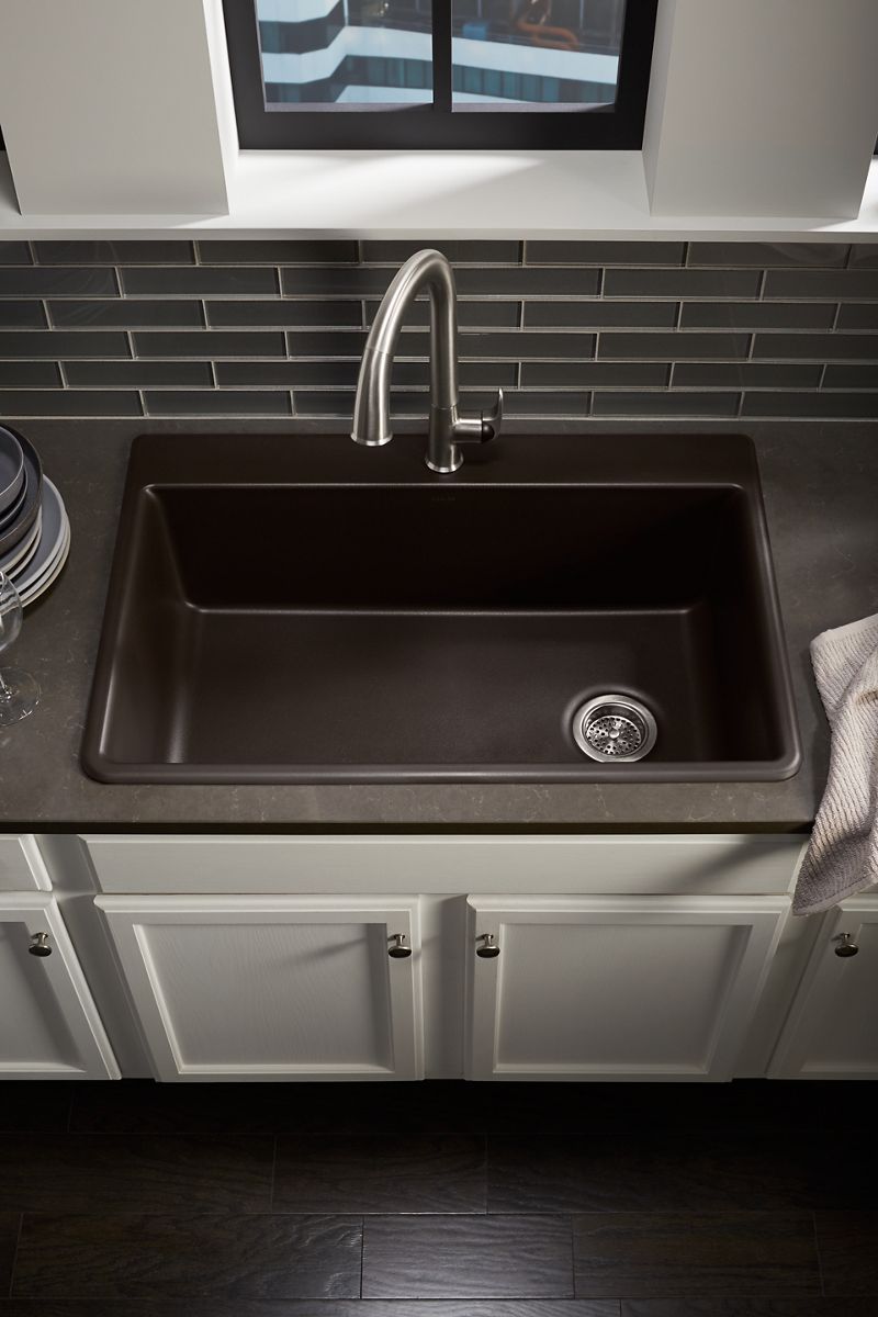 The Kennon single-bowl sink features an elegant, wave-like curve that complements any kitchen decor. The Kennon sink is made of KOHLER Neoroc®, a matte-finish composite material designed for extreme durability and unmatched beauty. Richly colored to complement any countertop, Neoroc resists scratches, stains, and fading and is highly heat- and impact-resistant.