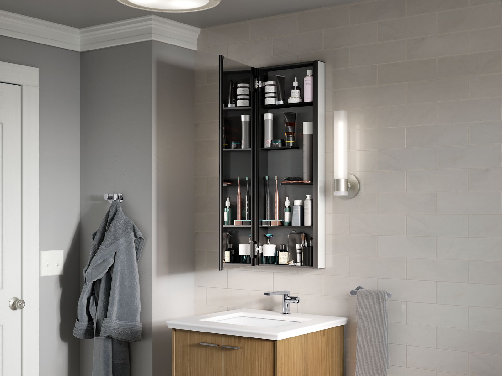 Maximize your bathroom storage with the Maxstow™ medicine cabinet. Staggered shelving holds tall and short items with no wasted space, fitting everything you need and keeping clutter off your countertop. The slim 3-1/2"-deep design provides the same internal storage space as traditional 5"-deep cabinets. Installation is fast and easy—simply screw to the wall, right out of the box.