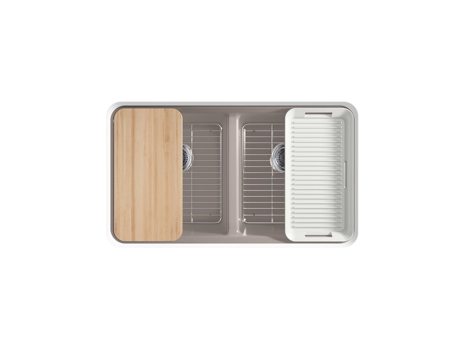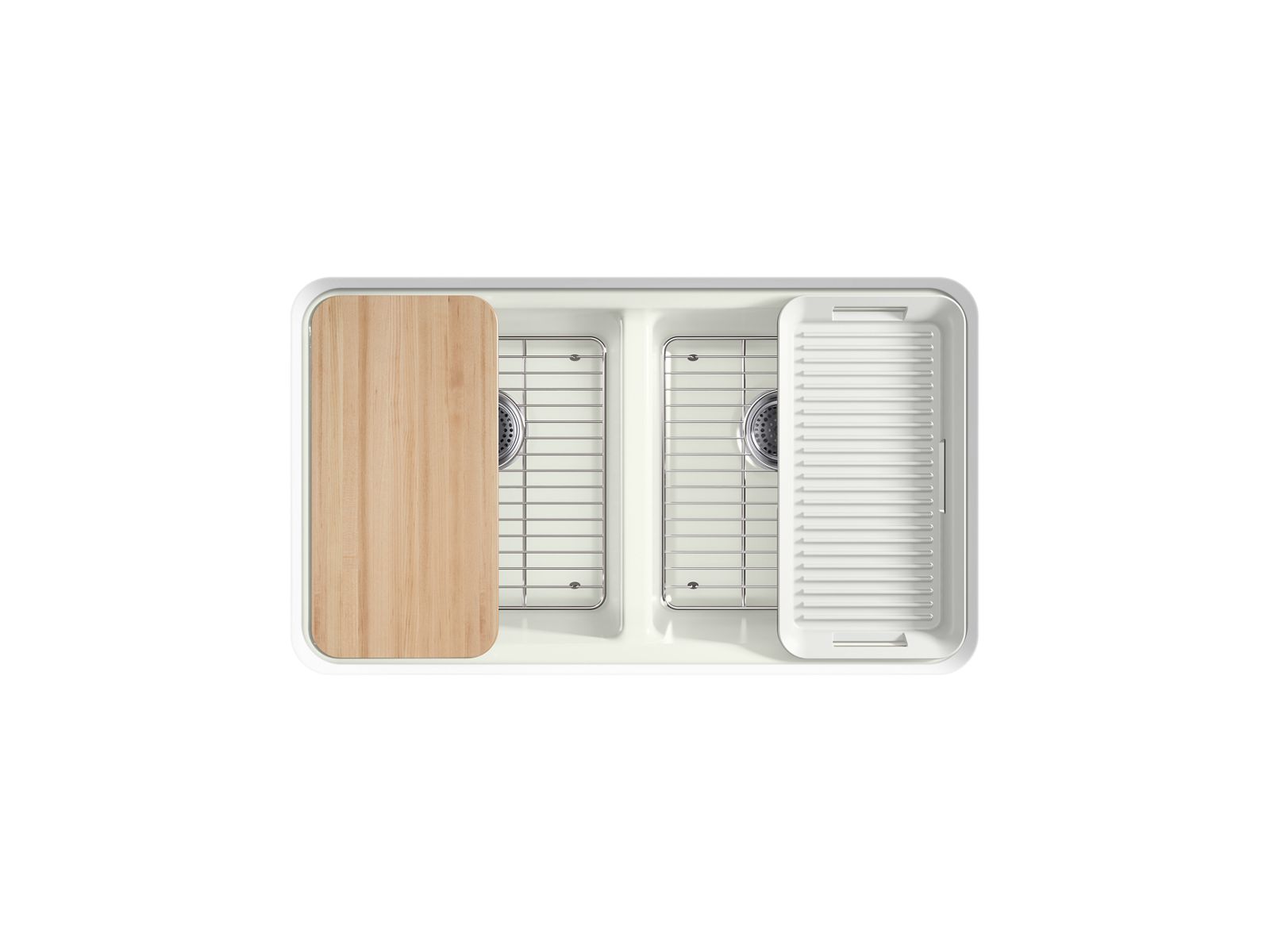 - Included accessories: cutting board, drain board, colander / drying rack, soaking bin with drain, stainless steel bottom sink racks