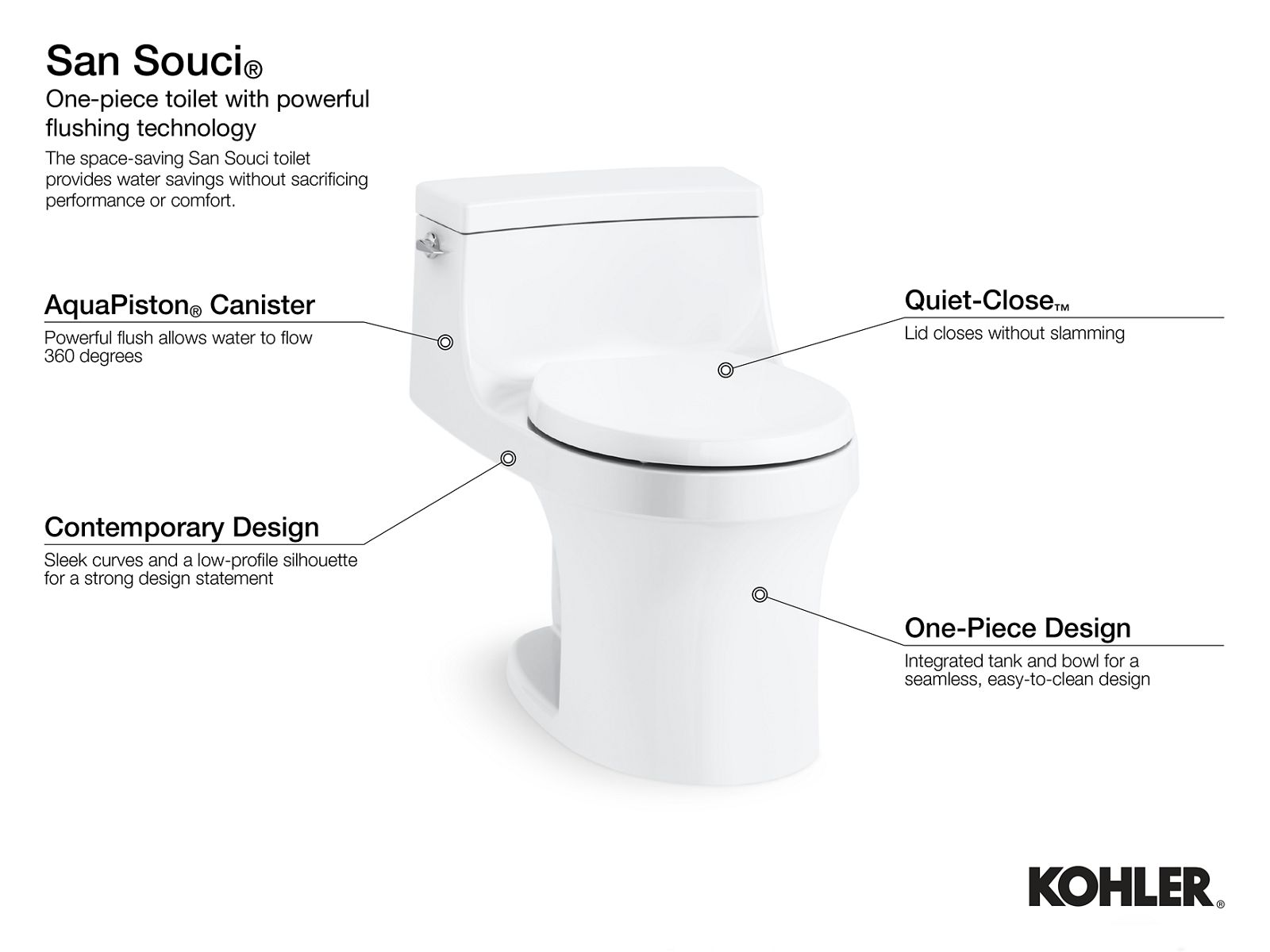 With sleek curves and a low-profile silhouette, the San Souci one-piece toilet makes a strong design statement. A compact tank curves seamlessly into a round-front bowl for a space-saving profile. A 1.28-gallon flush provides significant water savings of up to 16,500 gallons per year, compared to a 3.5-gallon toilet, without sacrificing performance. This toilet comes with a soft-close seat featuring innovative technology that prevents the seat from slamming and simplifies both cleaning and installation.