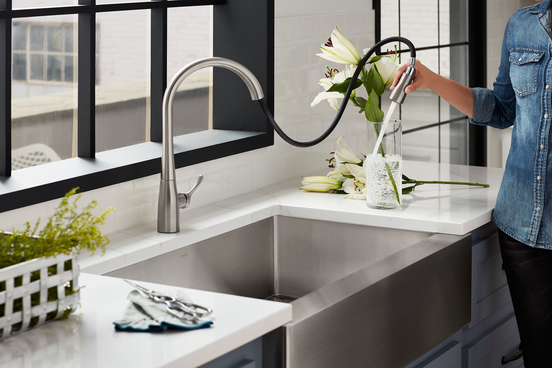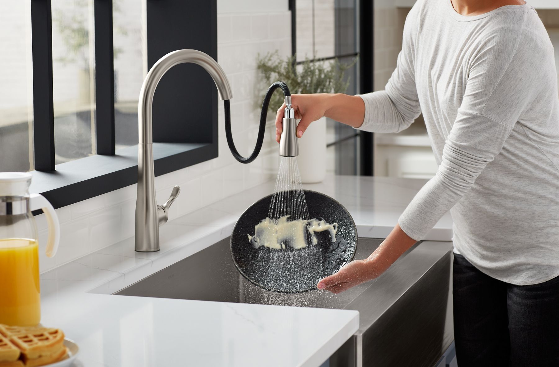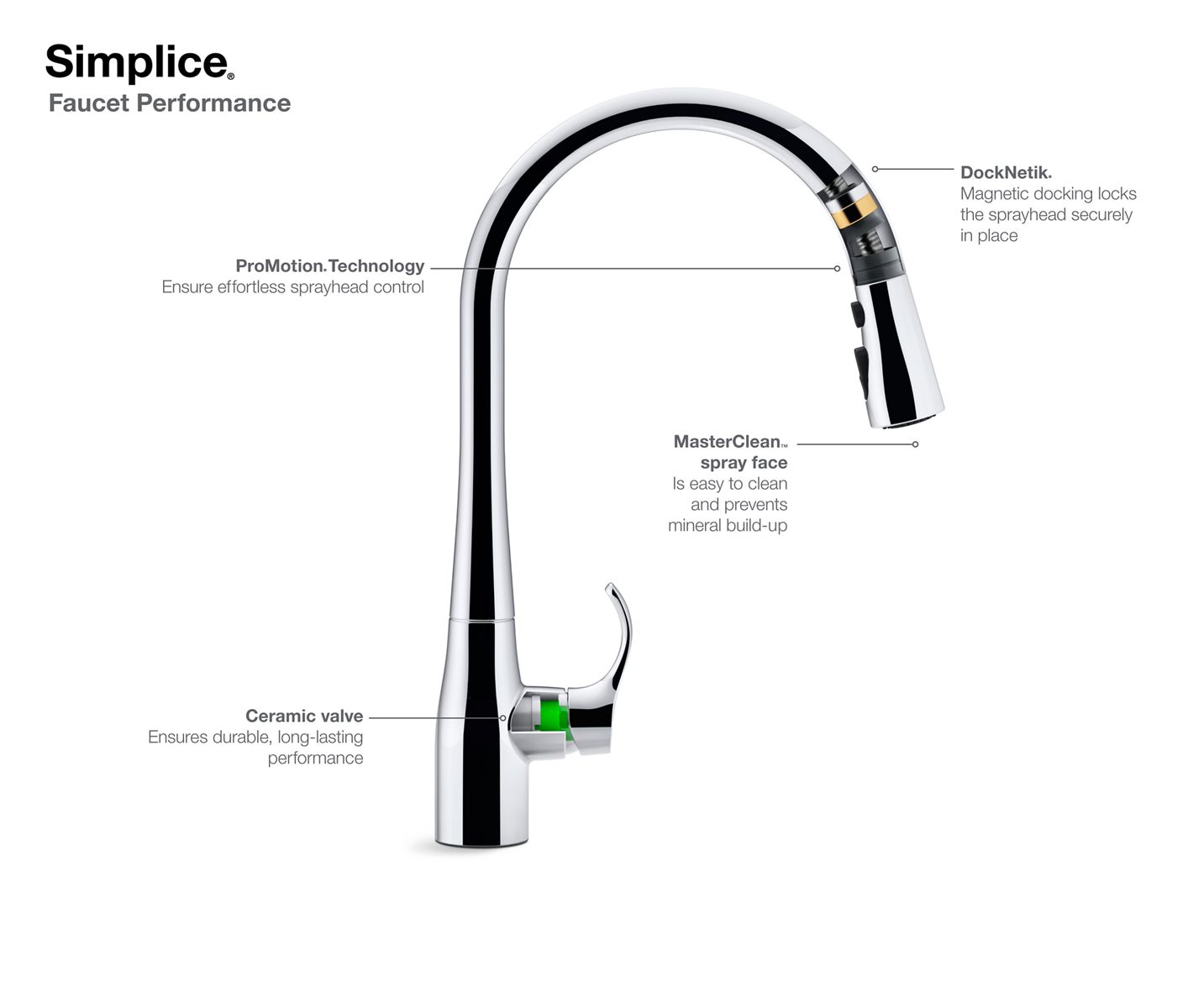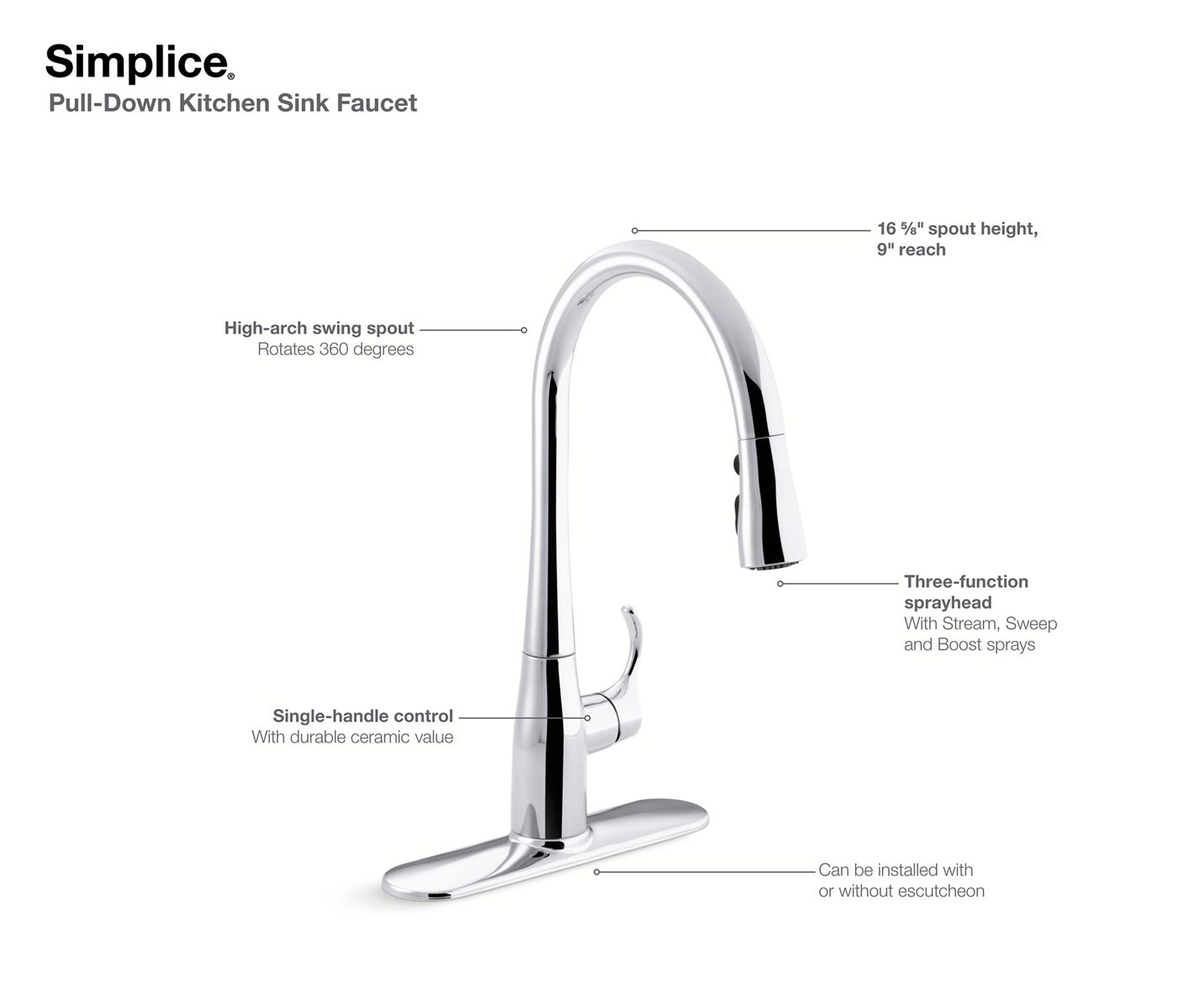 An innovative fit for a variety of kitchens and tasks, this Simplice kitchen faucet combines an elegant, universal design with exceptional ergonomics and functionality. The high-arch swing spout rotates 360 degrees, while the smoothly maneuvering sprayhead pulls down into the sink for up-close tasks, or out of the sink to fill pots. Sculpted buttons on the sprayhead ensure simple operation even with wet, soapy hands. Sweep spray creates a wide, forceful blade of water for superior cleaning. Kohler's docking system, DockNetik, secures the pull-down sprayhead to the spout.