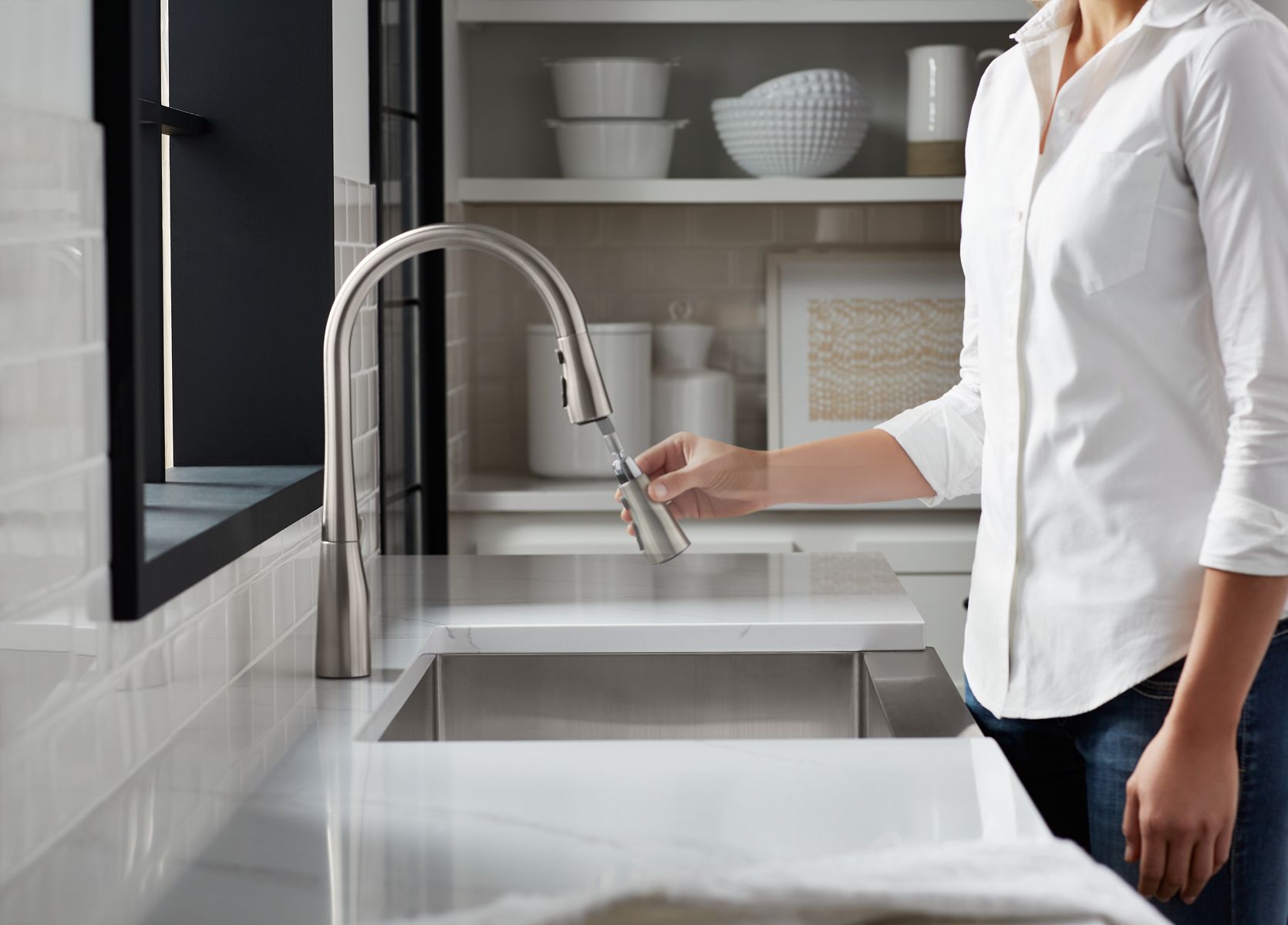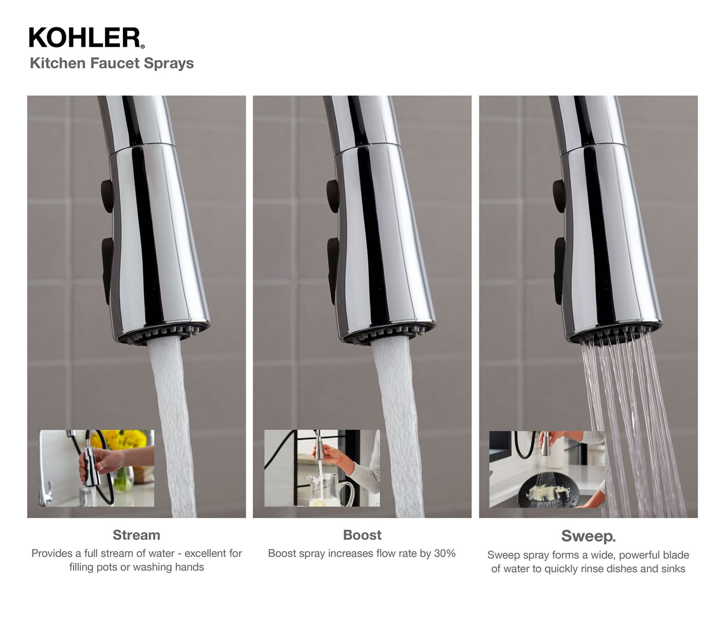- Three-function pull-down sprayhead with touch-control allows you to switch between stream, Sweep® spray and Boost technology