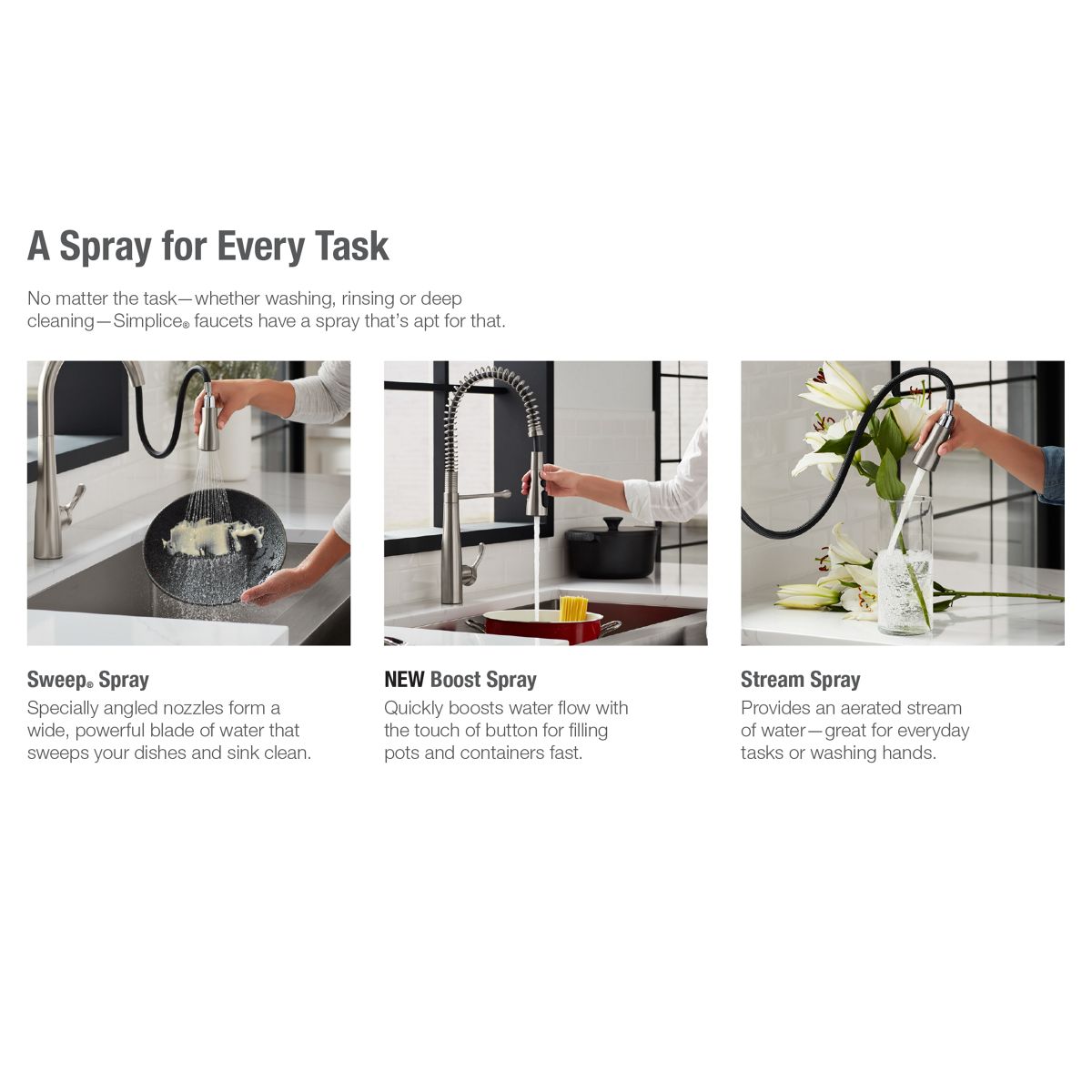 - Three-function pull-down sprayhead with touch-control allows you to switch between stream, Sweep® spray and Boost technology