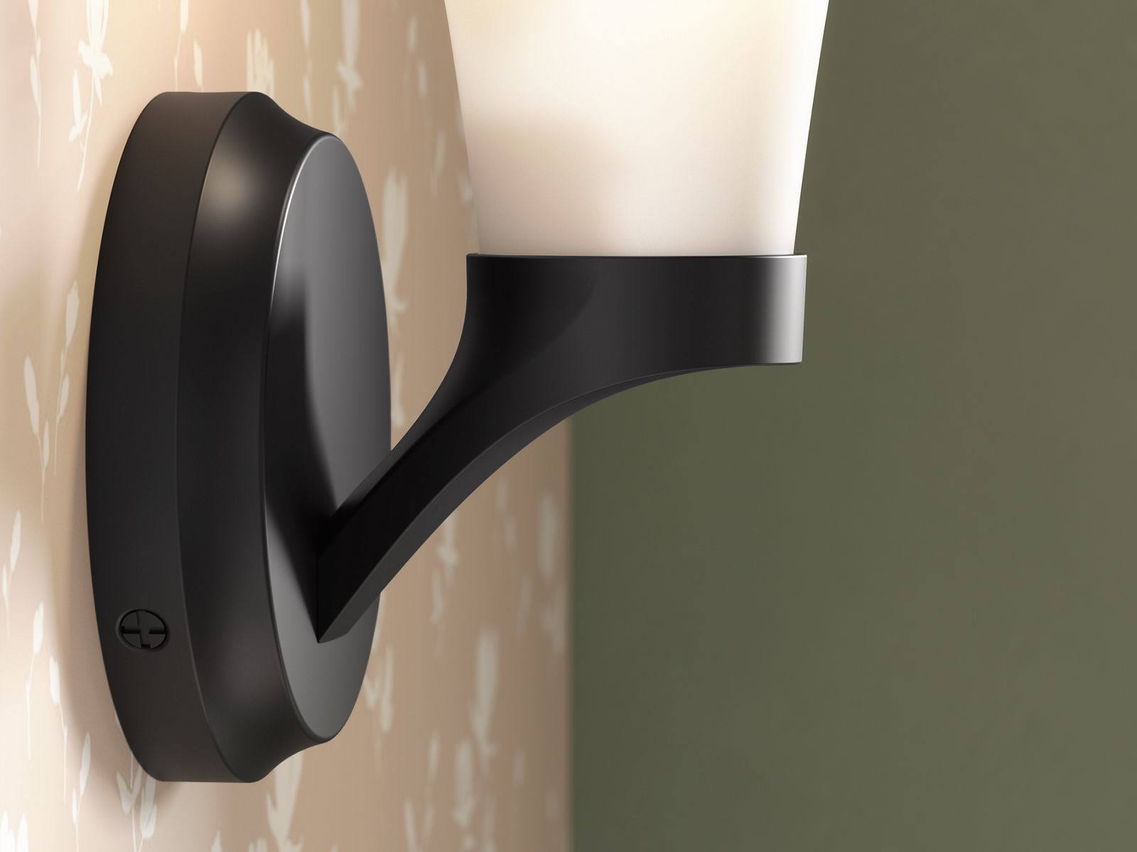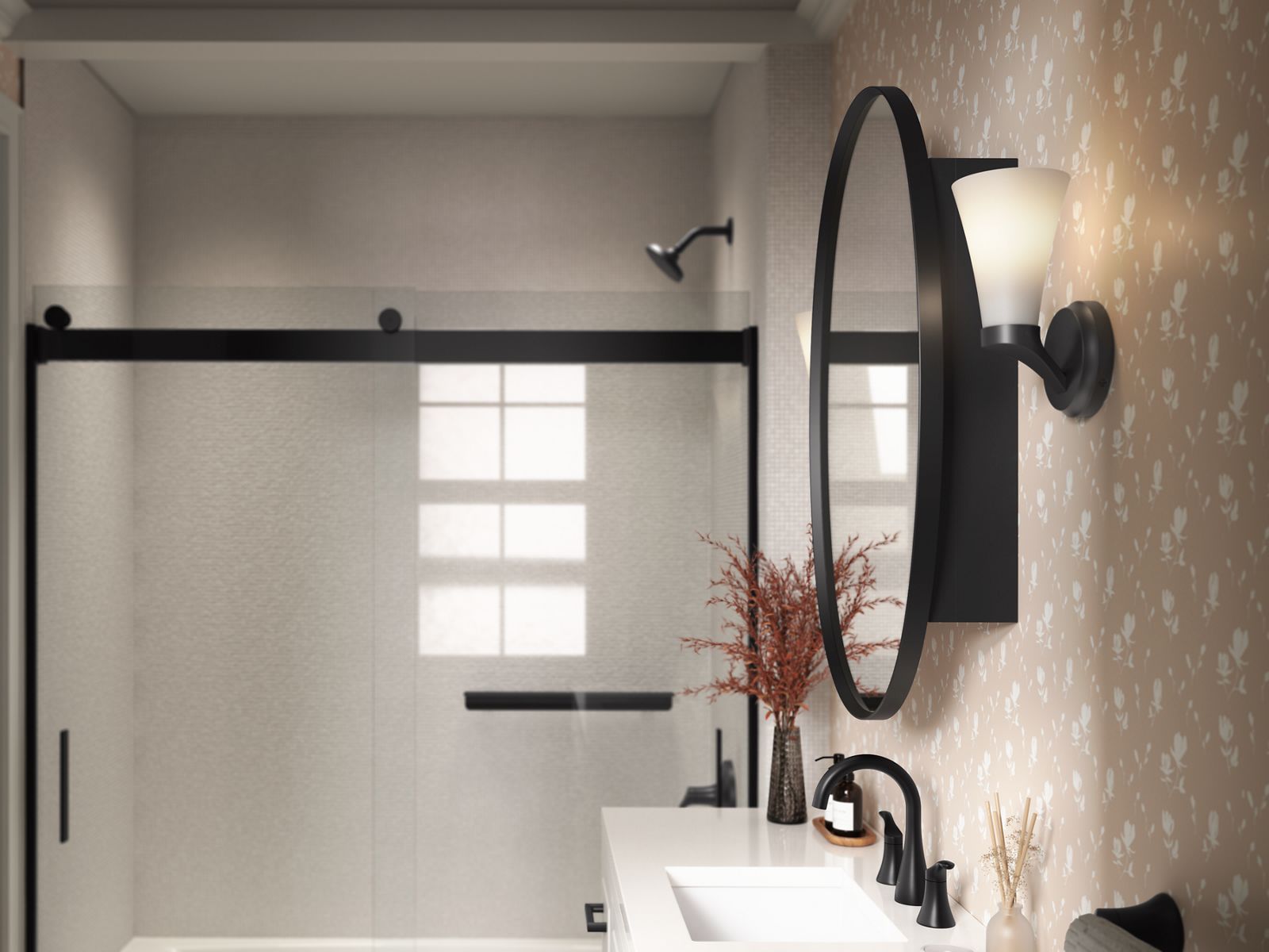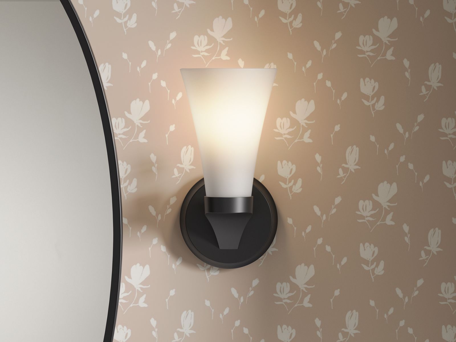 - Painted glass shade perfectly diffuses the light, reducing glare in the bathroom
