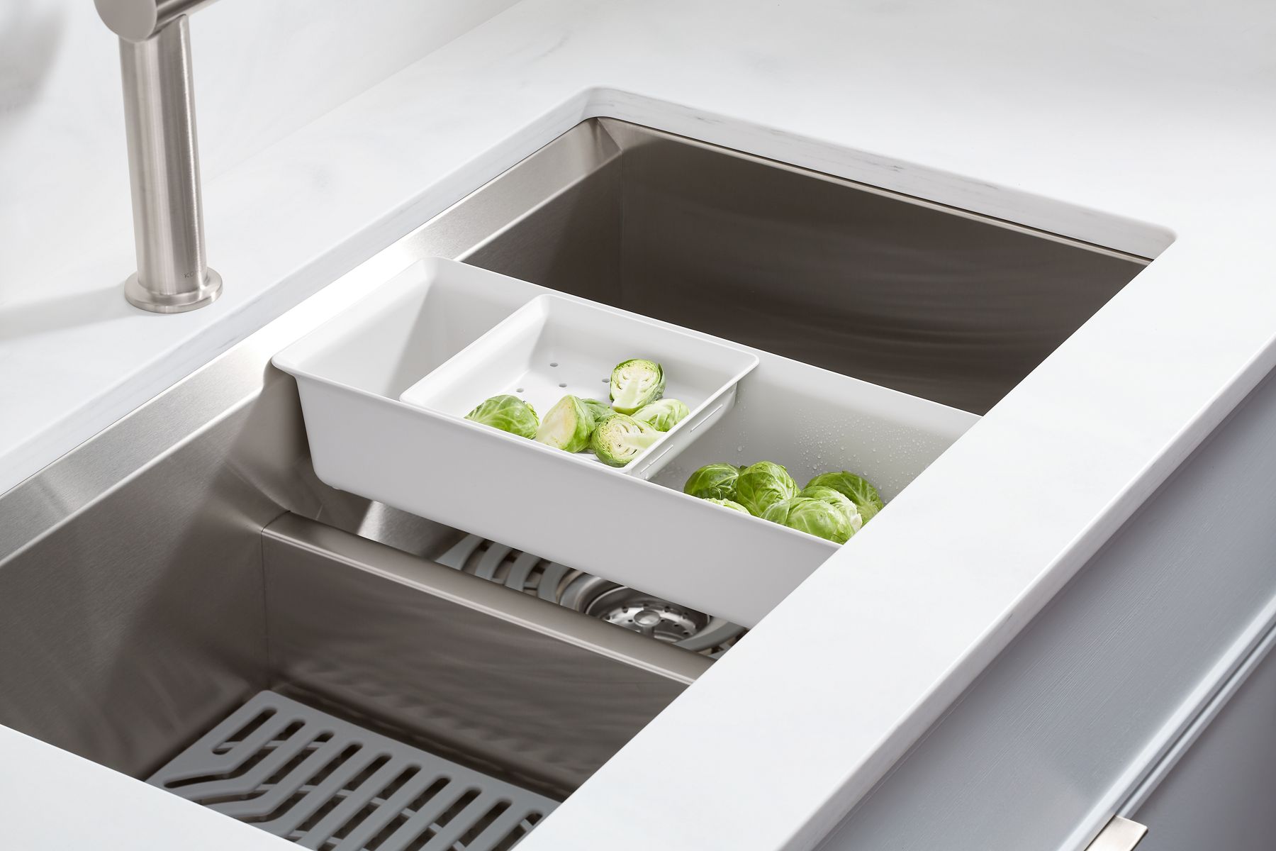 Imagine a kitchen sink with customized accessories that work with it so it works for you. Welcome to the Task workstation sink. Complete functionality packaged within a contemporary stainless steel design, the Task workstation sink makes food prep easier, with a two-piece nesting colander set and durable bamboo cutting board that each slide effortlessly within the sink to tailor your workstation for the task at hand. The dishwasher-safe silicone sink mats help protect both your sink and fragile dishes from damage. This workstation sink gives the word “task” a whole new meaning.