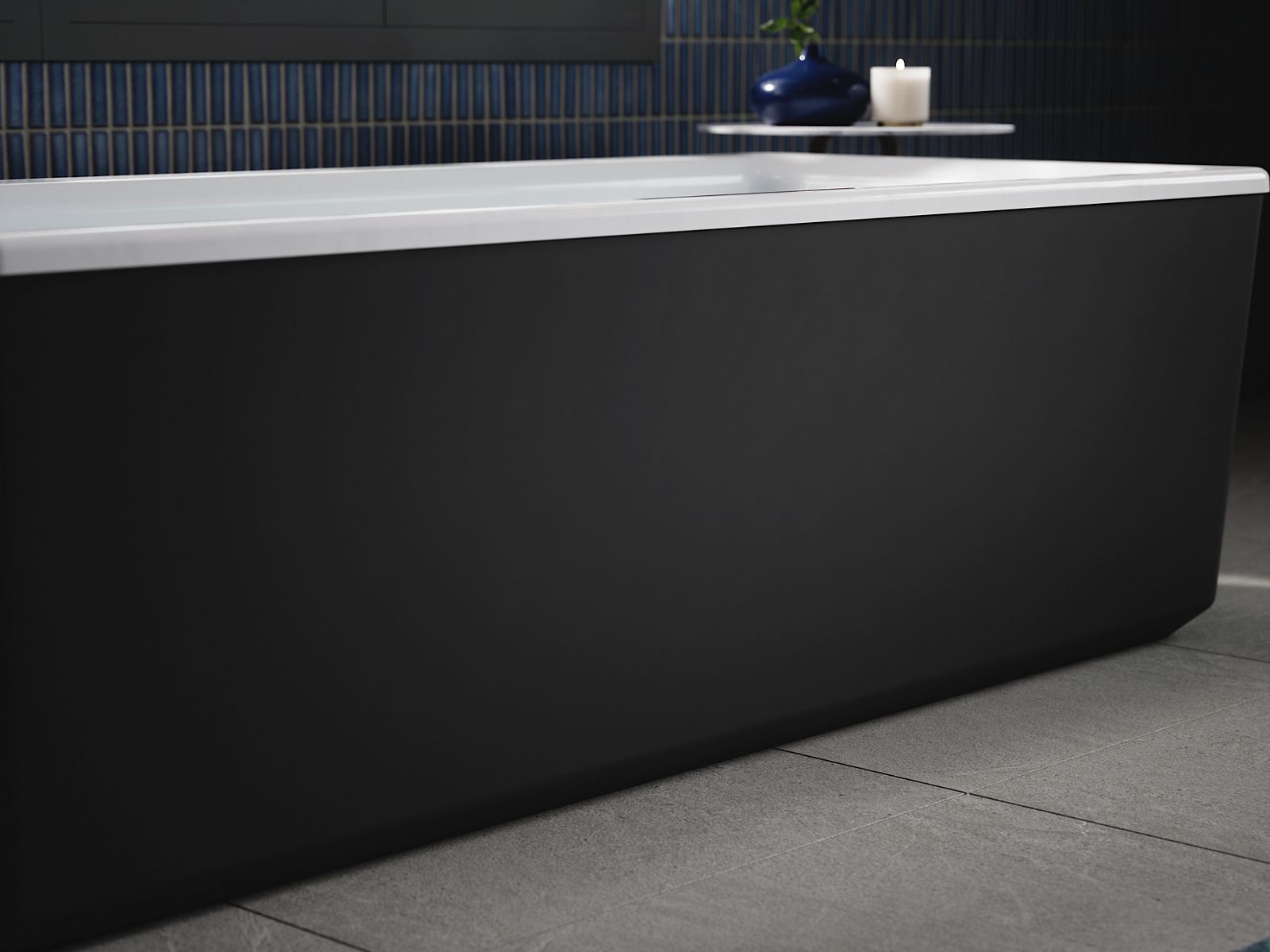 The Volute freestanding bath collection is a contemporary take on the classic charm of KOHLER® enameled cast iron. Designed to make an enduring statement of beauty, KOHLER enameled cast iron is scratch- and stain-resistant. The modern lines of the collection’s design combine with the timeless allure of the cast iron to create an unforgettable look in any bathing space. Available in two shapes and as many sizes, the Volute freestanding bath collection also offers you the choice of a shroud or bath base in black or white. And because Volute baths are manufactured with the drain and overflow preinstalled, they are less complicated to set up. To complete your bath, K-36361 drain trim kits are available in several finishes to coordinate with KOHLER bathroom faucets and accessories.