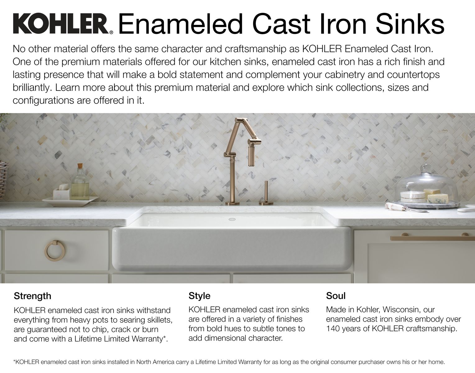 The Whitehaven apron-front kitchen sink features a streamlined and versatile farmhouse style to complement any decor. Perfect for remodeling projects, it has a shortened apron that allows for installation on most new or existing 36-inch standard cabinetry. The Self-Trimming® design requires only a simple rough cut, overlapping the cabinet face for beautiful results and easy installation. A low barrier divides the two compartments, making it easy to wash and rinse large items while still keeping the two basins separate. Crafted from enameled cast iron, this sink resists chipping, cracking, or burning for years of beauty and reliable performance.