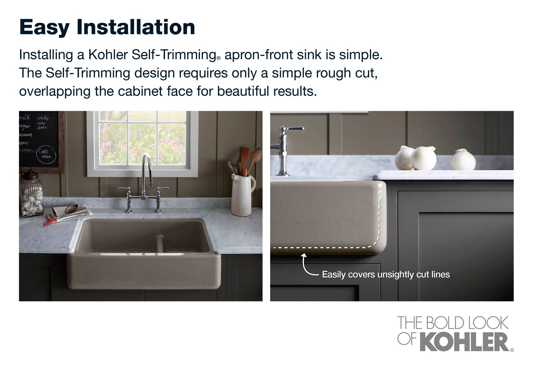 The Whitehaven apron-front kitchen sink features a streamlined and versatile farmhouse style to complement any decor. The Self-Trimming® design requires only a simple rough cut, overlapping the cabinet face for beautiful results. The sink is designed to fit in most standard 36-inch apron-front cabinetry. A low barrier divides the two compartments, making it easy to wash and rinse large items while still keeping the two basins separate. Crafted from enameled cast iron, this sink resists chipping, cracking, or burning for years of beauty and reliable performance.